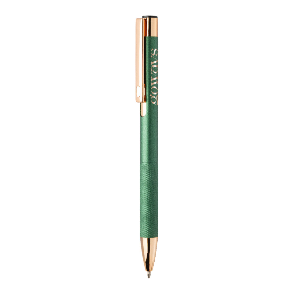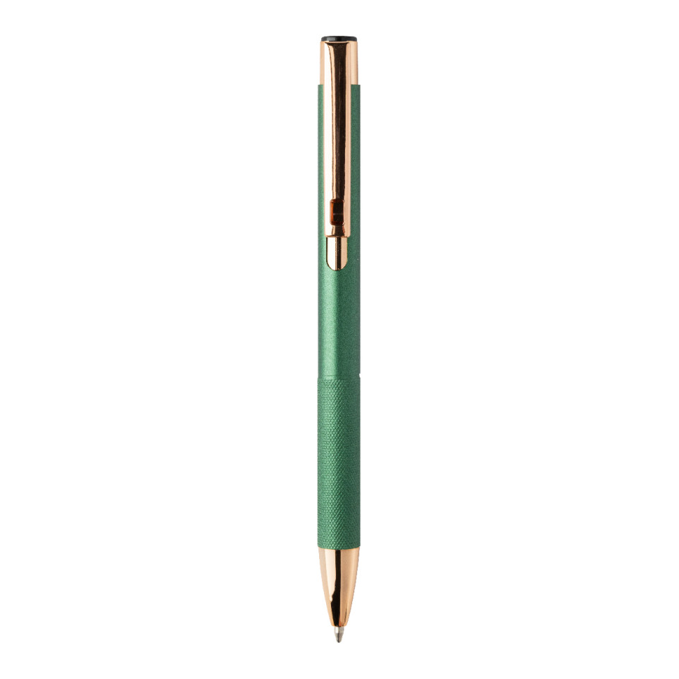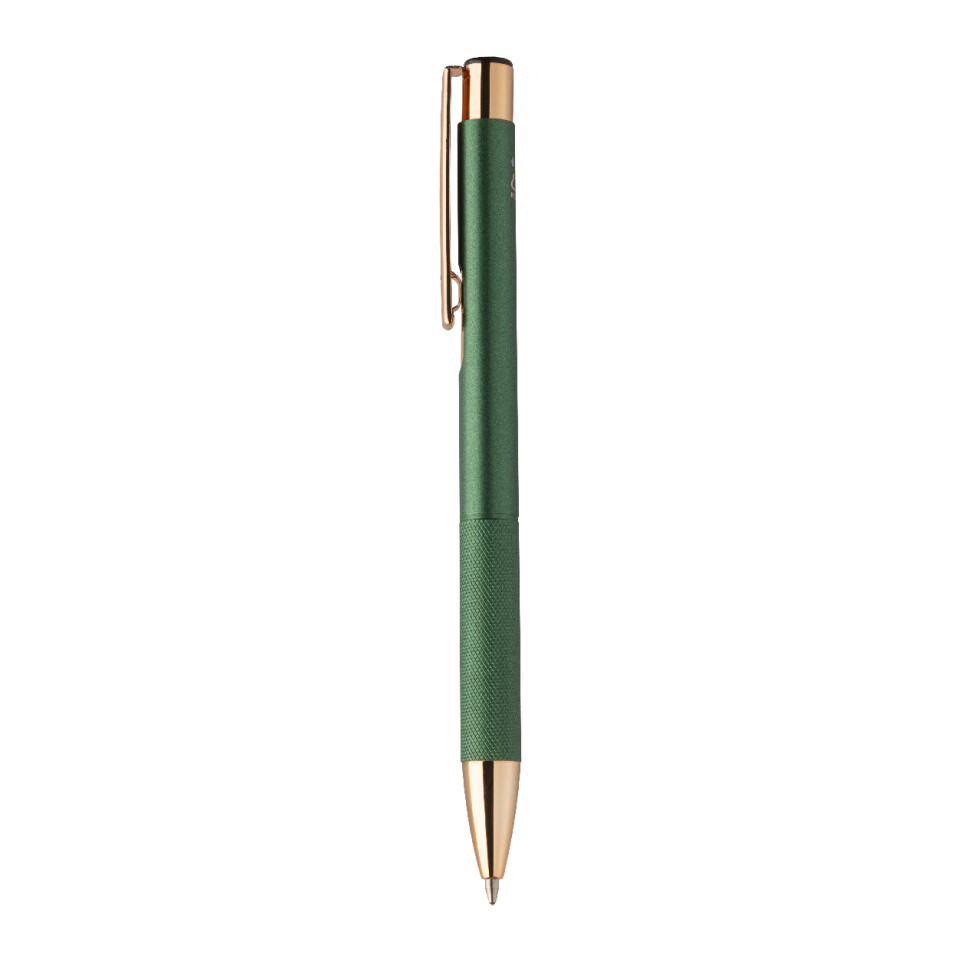 Rozoros green ballpoint pen combines recycled aluminium with a matte finish, textured grip, and rose gold accents. Designed for everyday writing at work, school, or meetings, it delivers smooth notes with a reliable blue refill.