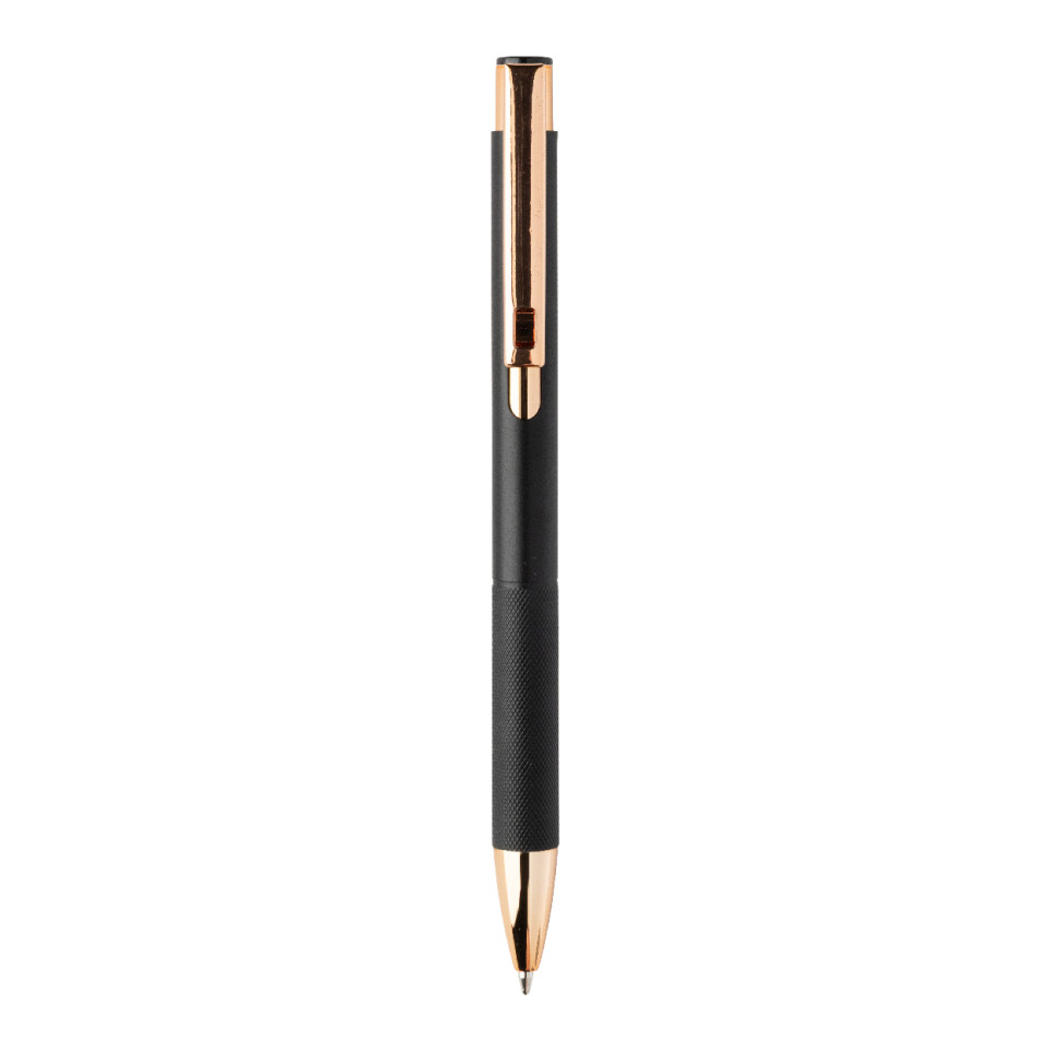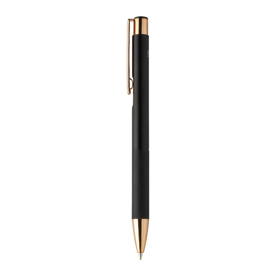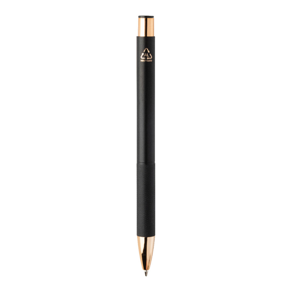 Elegant black ballpoint pen crafted from recycled aluminium, featuring a matte finish, a textured grip for control, and rose gold accents. Perfect for professional settings, everyday writing, or sophisticated business gifts.