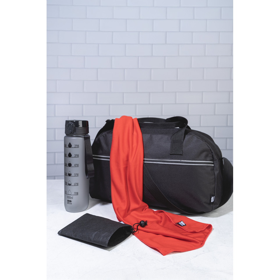 A sport microfiber towel crafted from RPET materials, ideal for gym sessions, outdoor activities, and travel, supplied with a matching RPET non-woven carry pouch.