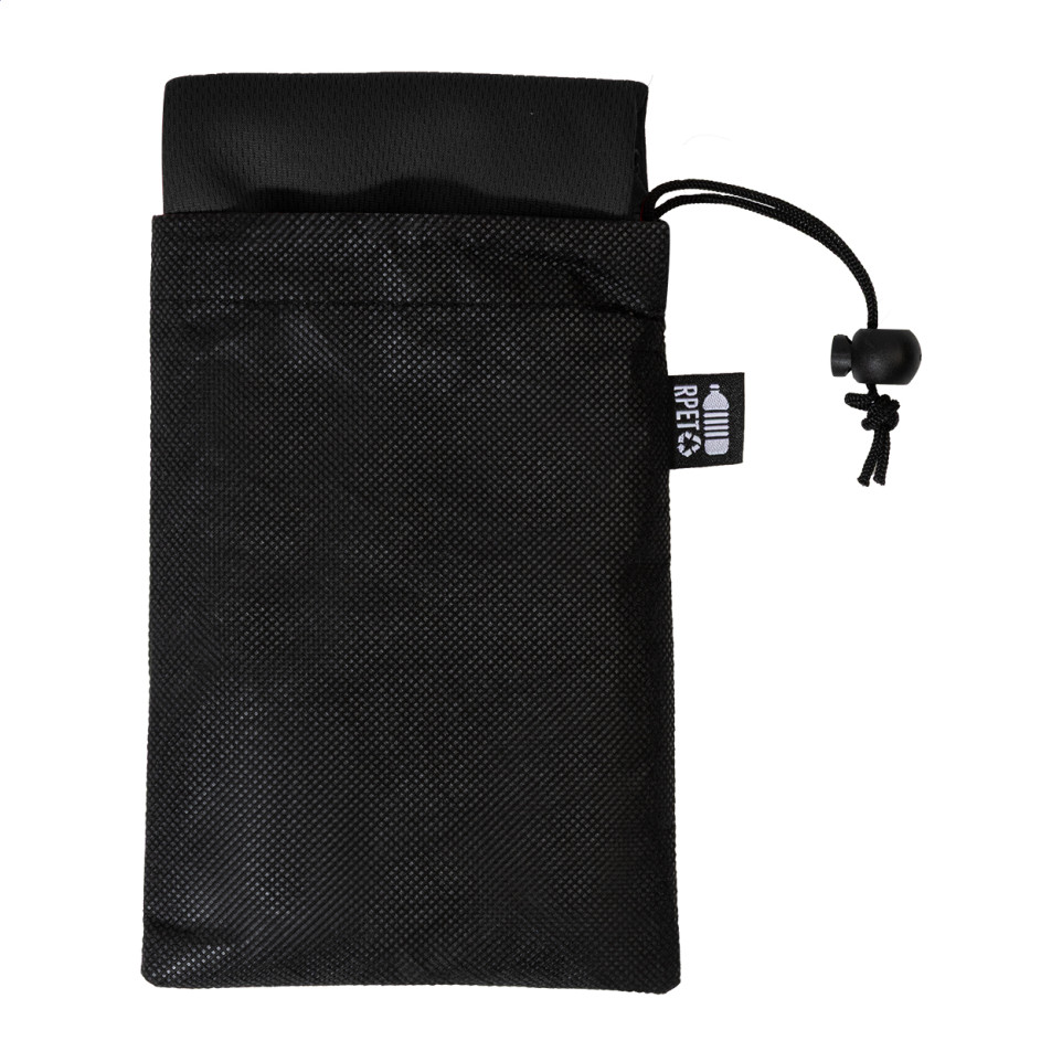 RPET microfiber sports towel in black, delivered in an RPET non-woven carry pouch with distinctive RPET label. Ideal for workouts, gym sessions, and outdoor activities, offering quick absorption and portability at 140 g/m².