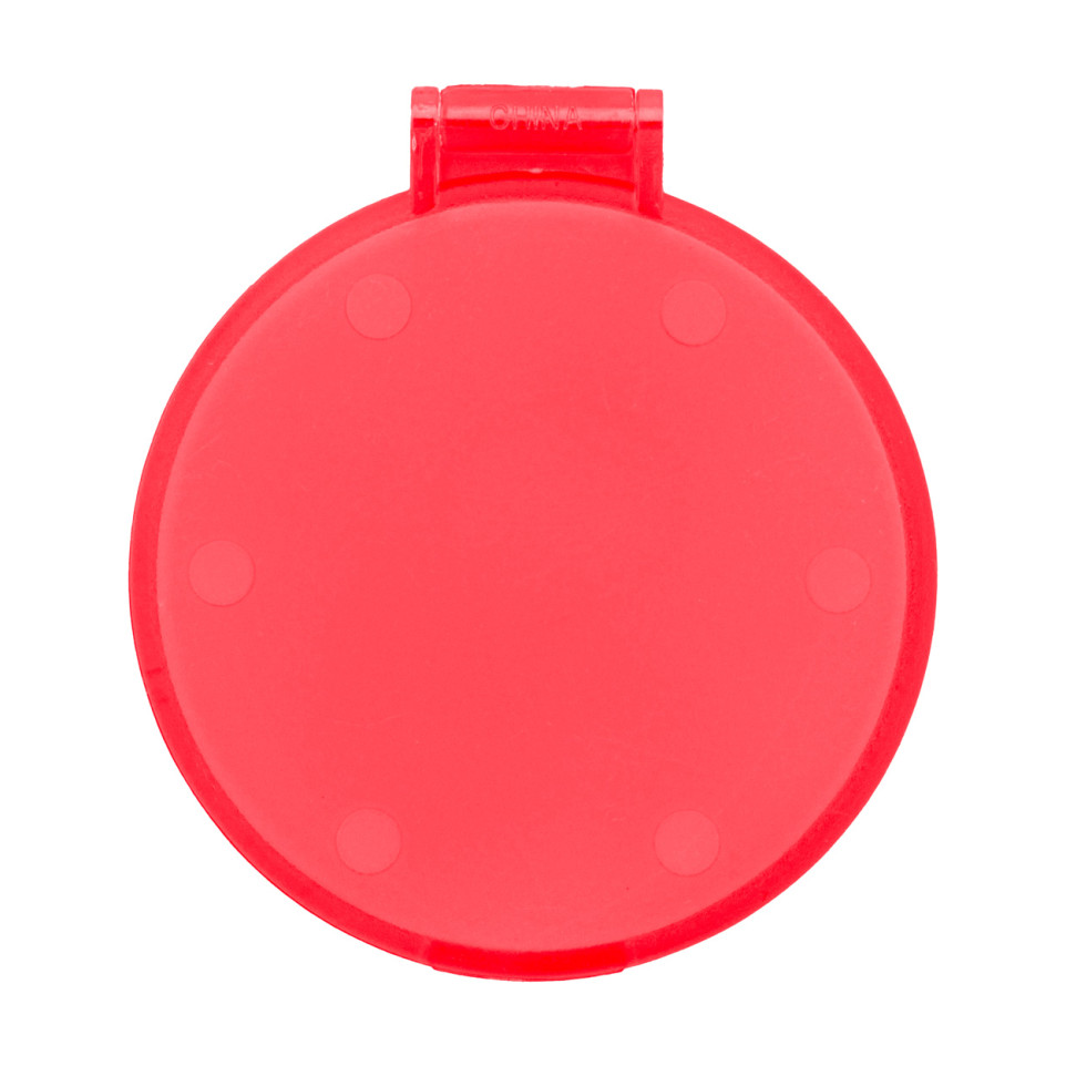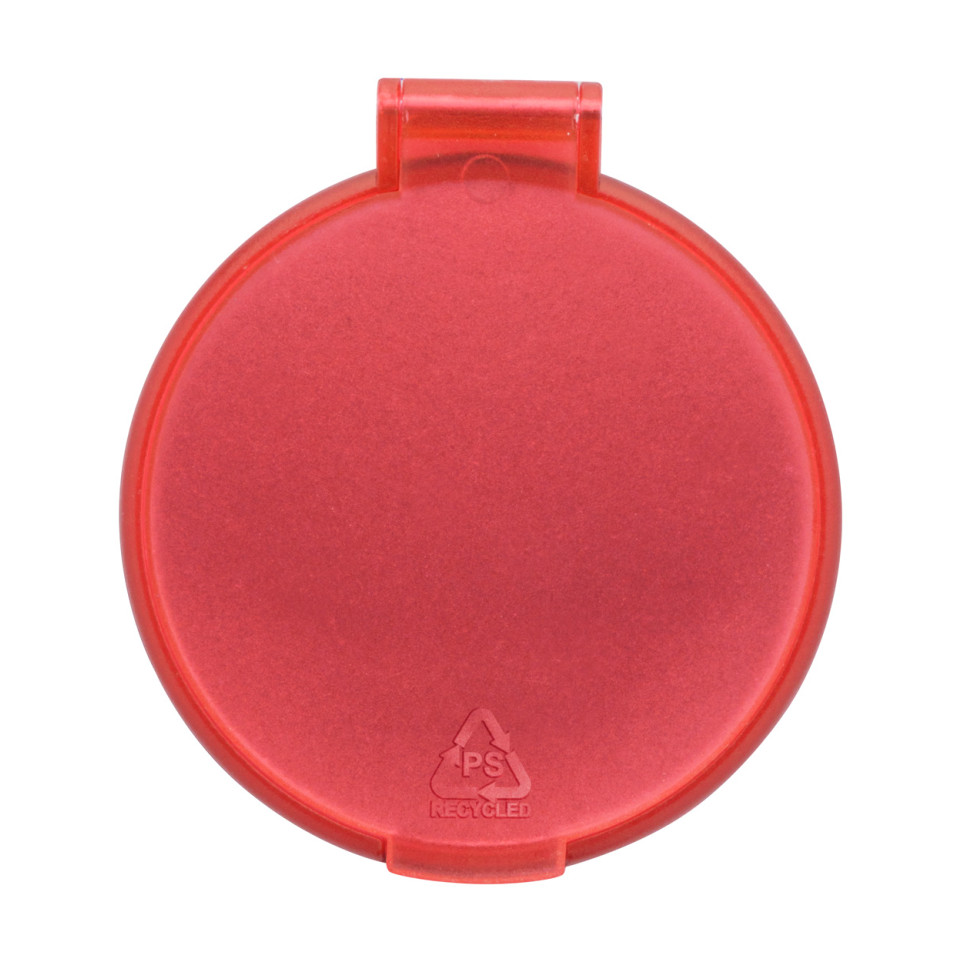 Round pocket mirror in translucent recycled PS case, perfect for on-the-go touch-ups. This compact and eco-friendly accessory fits easily in purses or pockets.