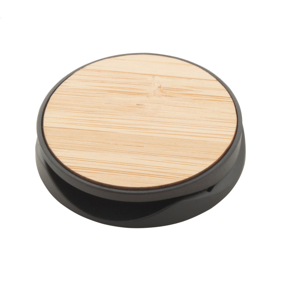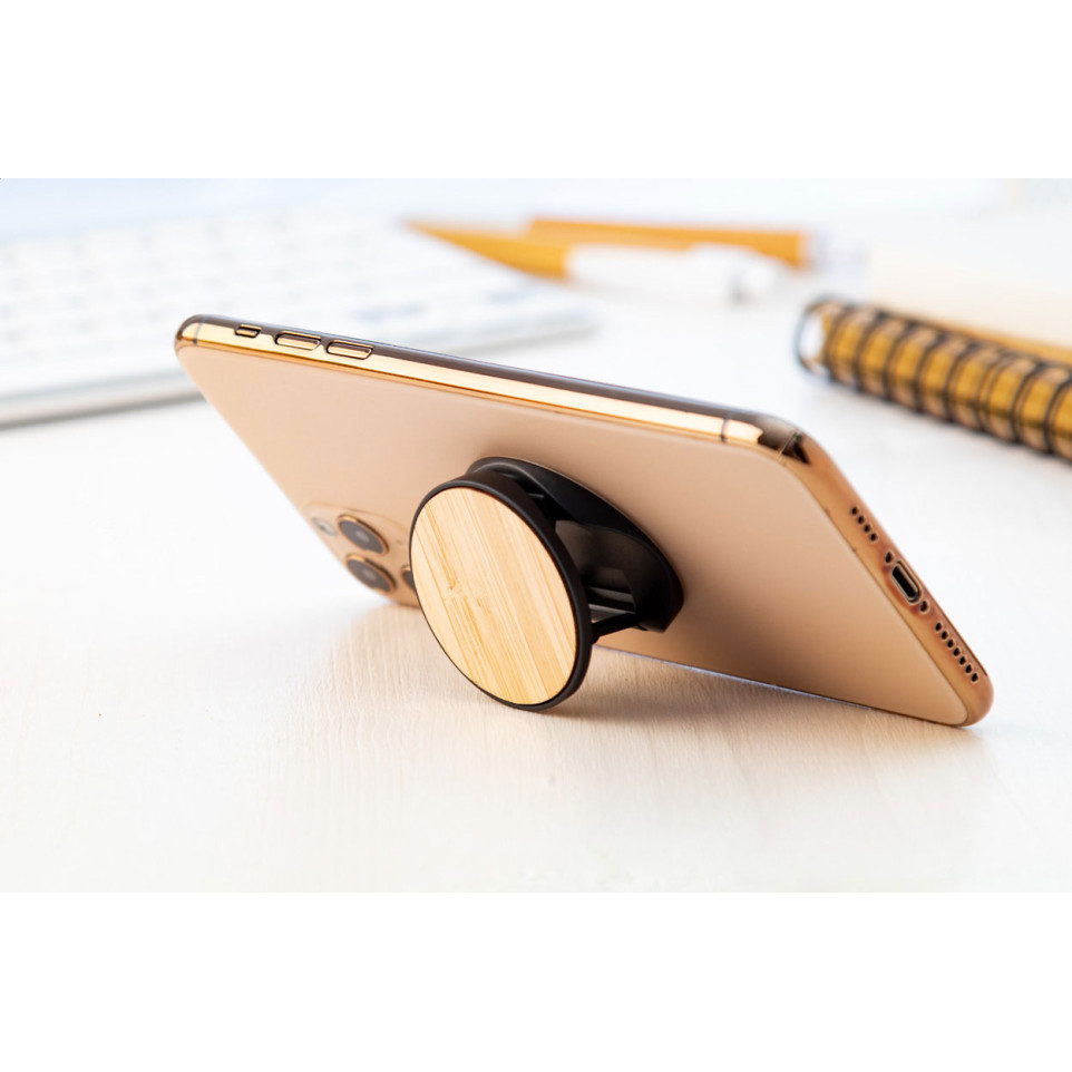 Bonabik mobile holder is a sleek, round-shaped smartphone stand with a bamboo cover and self-adhesive base, offering convenient hands-free viewing and stable support for everyday device use.