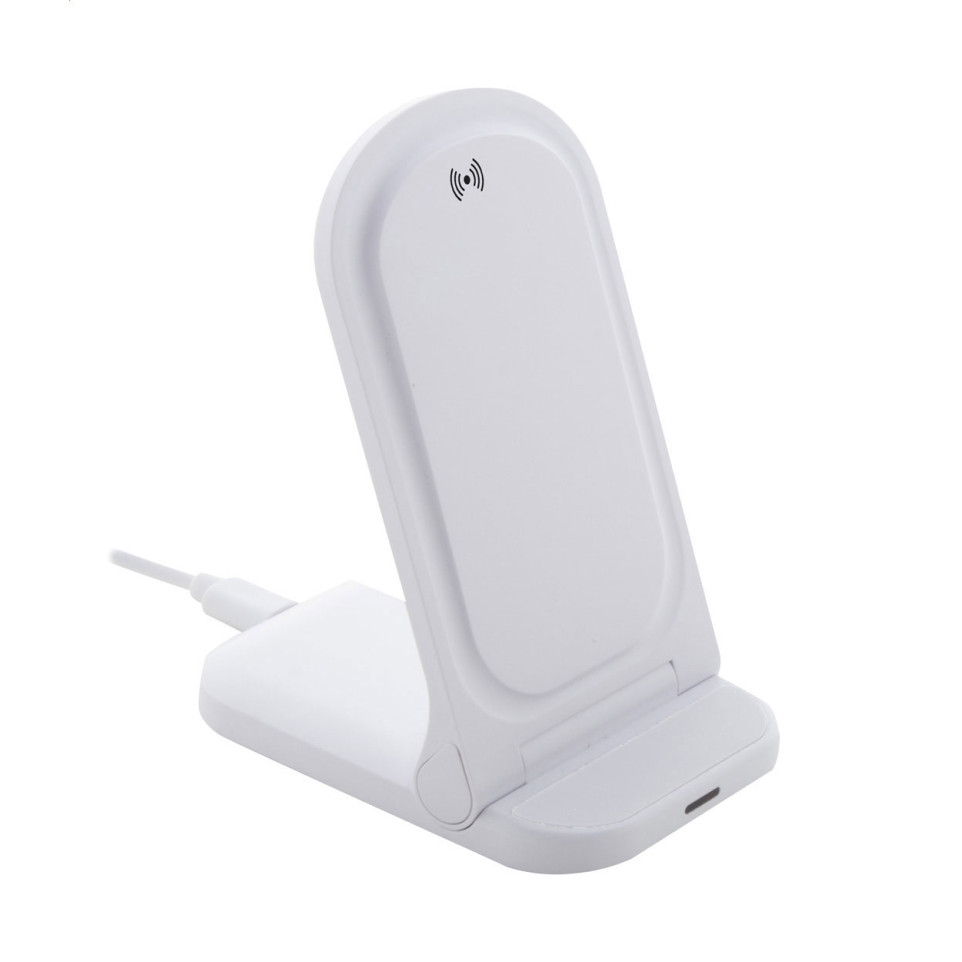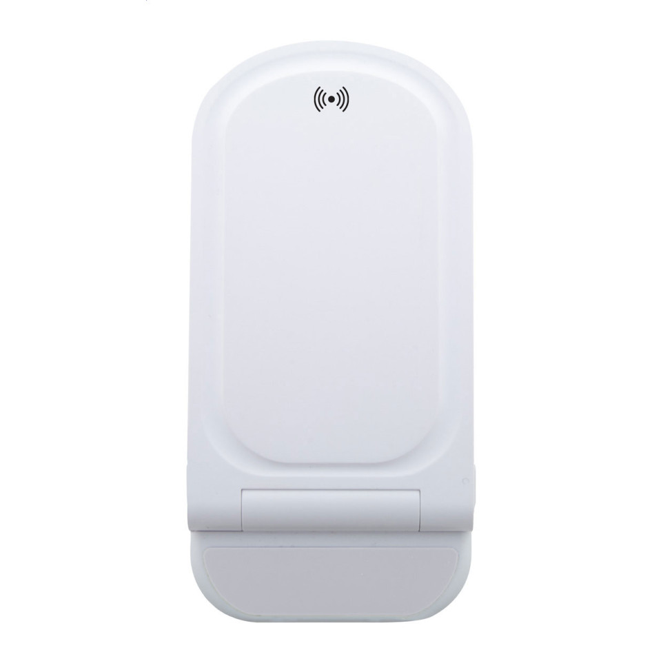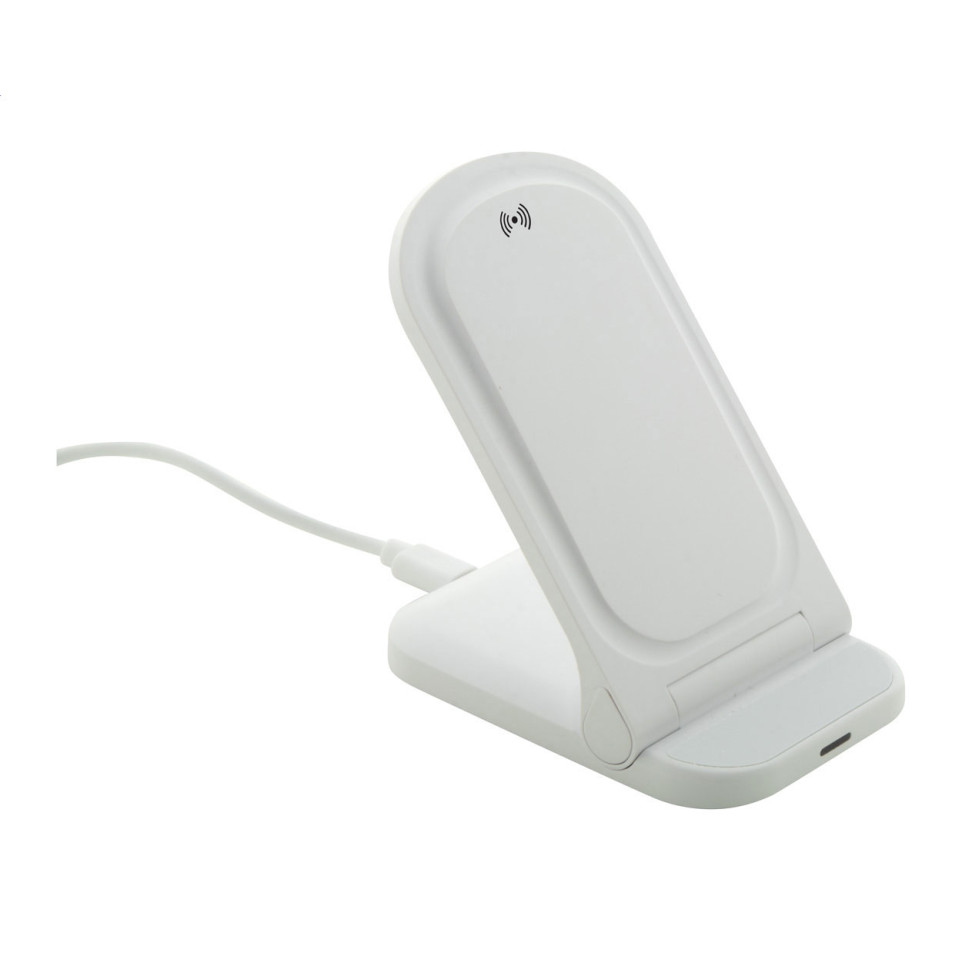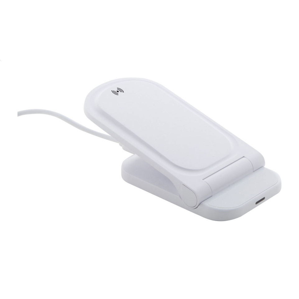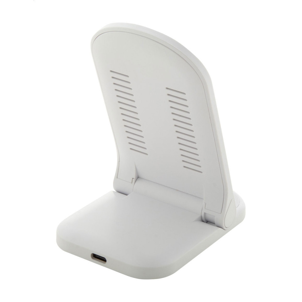 The Rewolt white RABS wireless charger mobile holder is a foldable, adjustable desk accessory made from recycled ABS plastic. It functions as both a secure mobile holder and a 15W fast wireless charger, making it ideal for workspace organization and efficient device charging.
