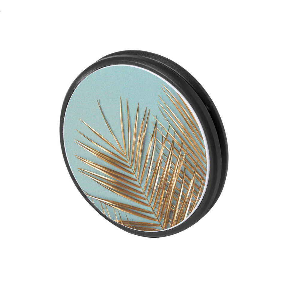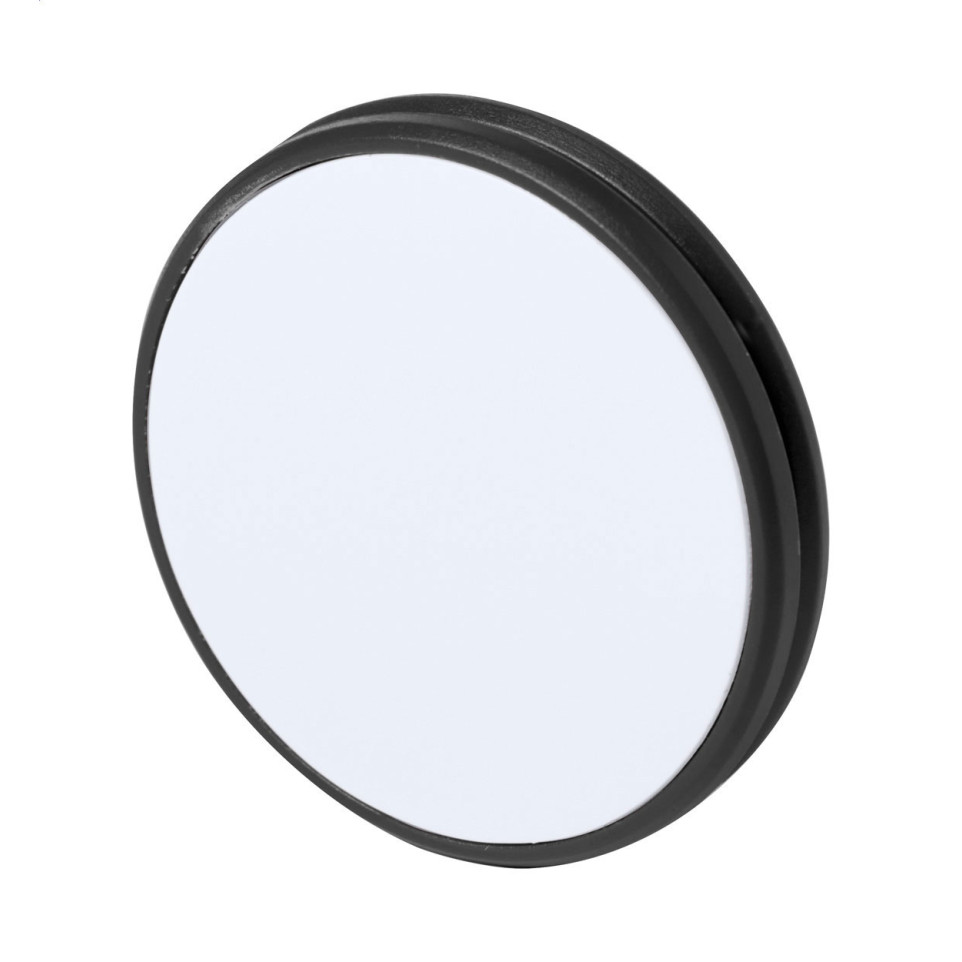 Round, black plastic mobile holder with a self-adhesive base designed to securely mount your device on flat surfaces in offices, vehicles, or at home. Compact and unobtrusive, it keeps your mobile accessible and visible.