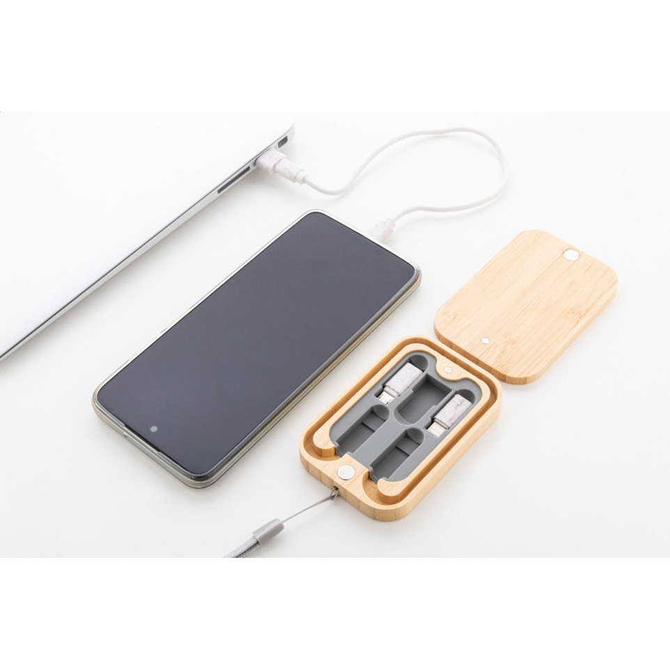 Ecological wheat straw plastic USB charger cable set housed in a sleek magnetic bamboo case with carry strap. Features USB-C cable with multiple adaptors for versatile device charging on-the-go.