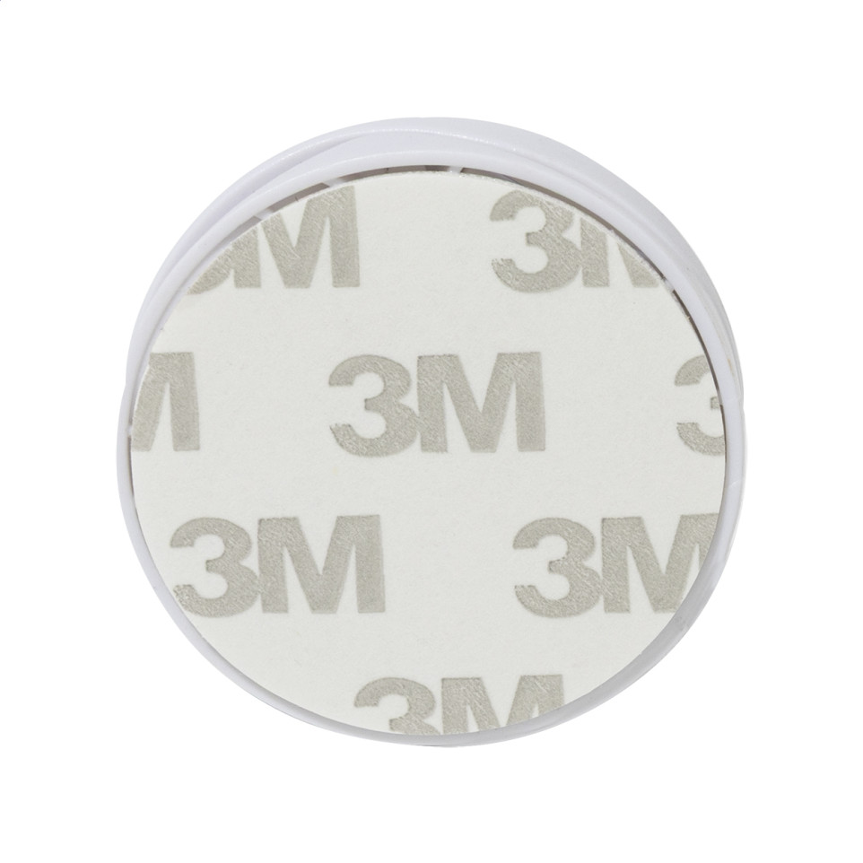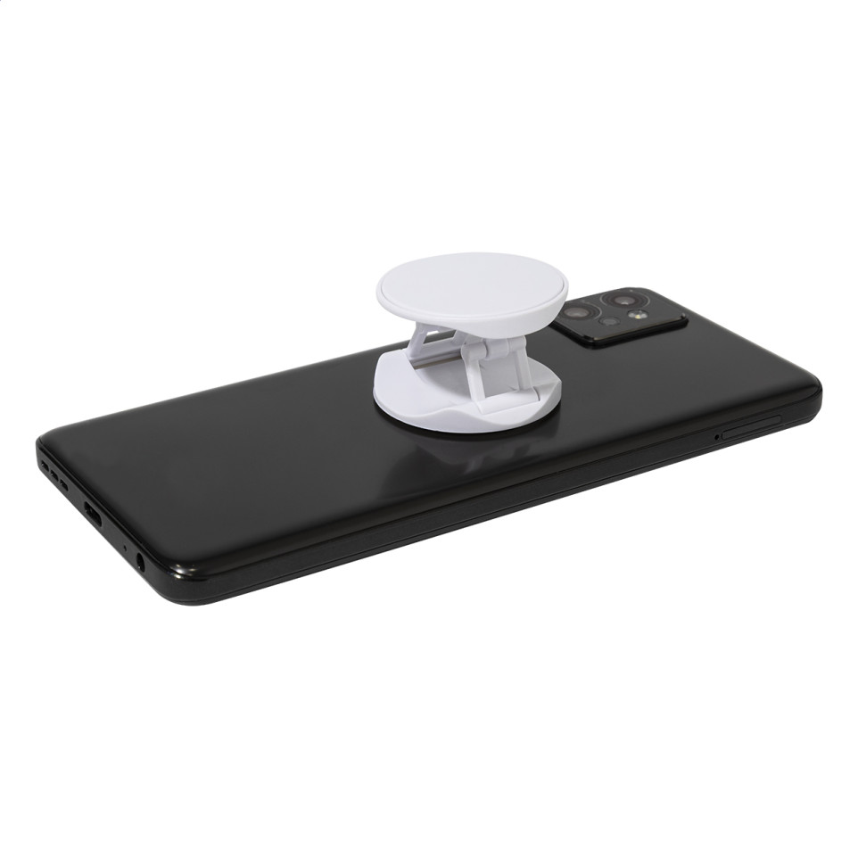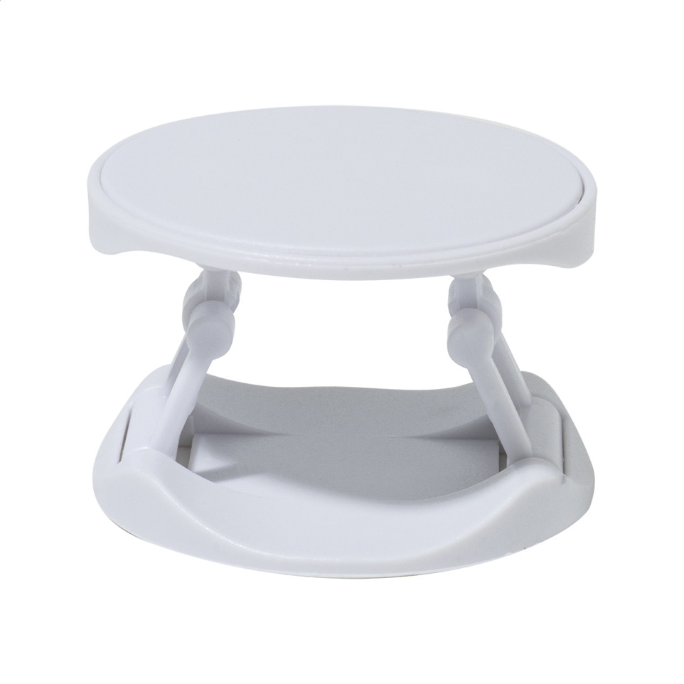Round-shaped recycled ABS mobile holder with a self-adhesive base that attaches securely to desks, dashboards, or surfaces, keeping smartphones accessible for hands-free use during drives, work, or daily tasks.