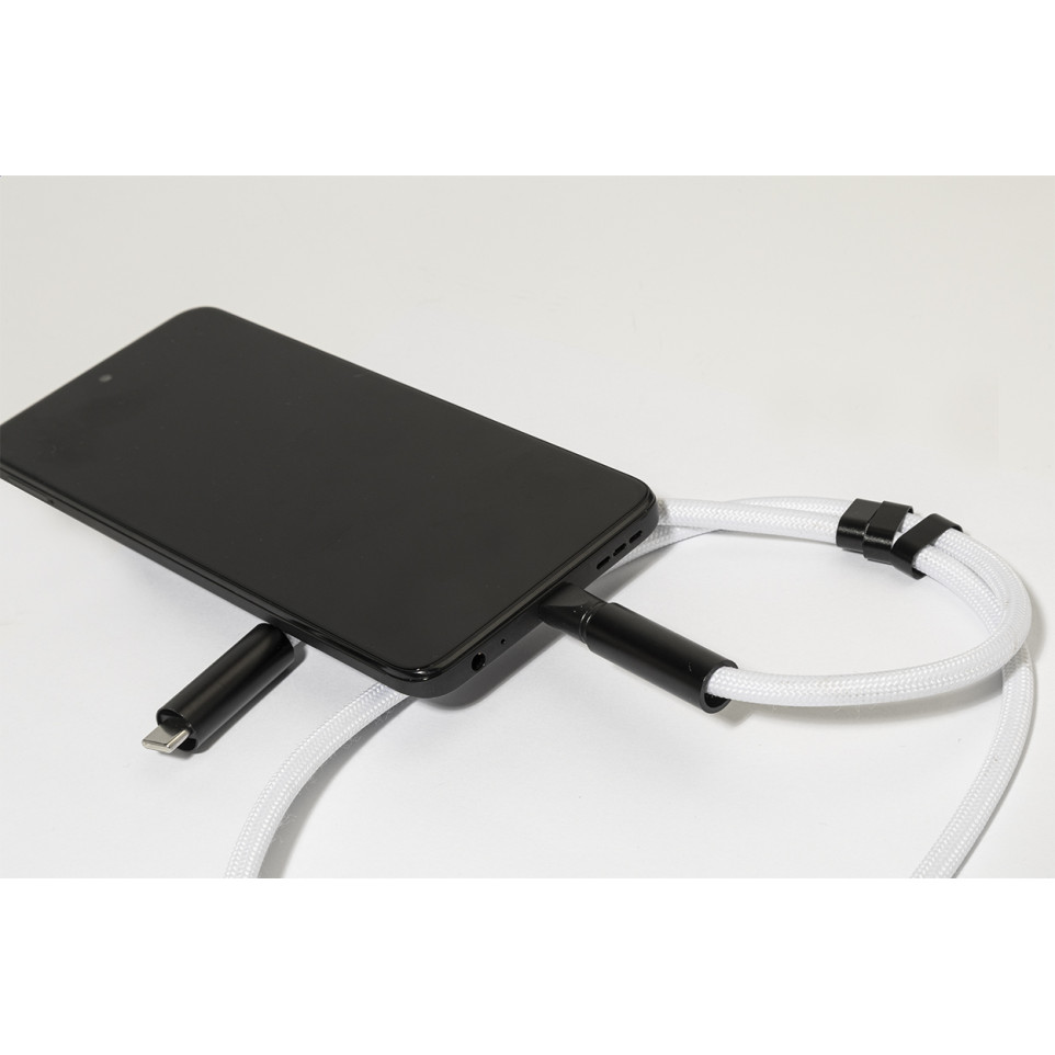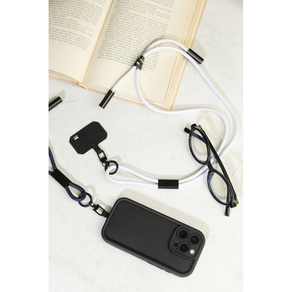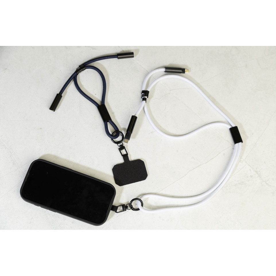A white RPET mobile lanyard holder combining everyday phone carrying convenience with an integrated 60W USB-C to USB-C fast charging and data transfer cable, designed for eco-conscious users on the go.
