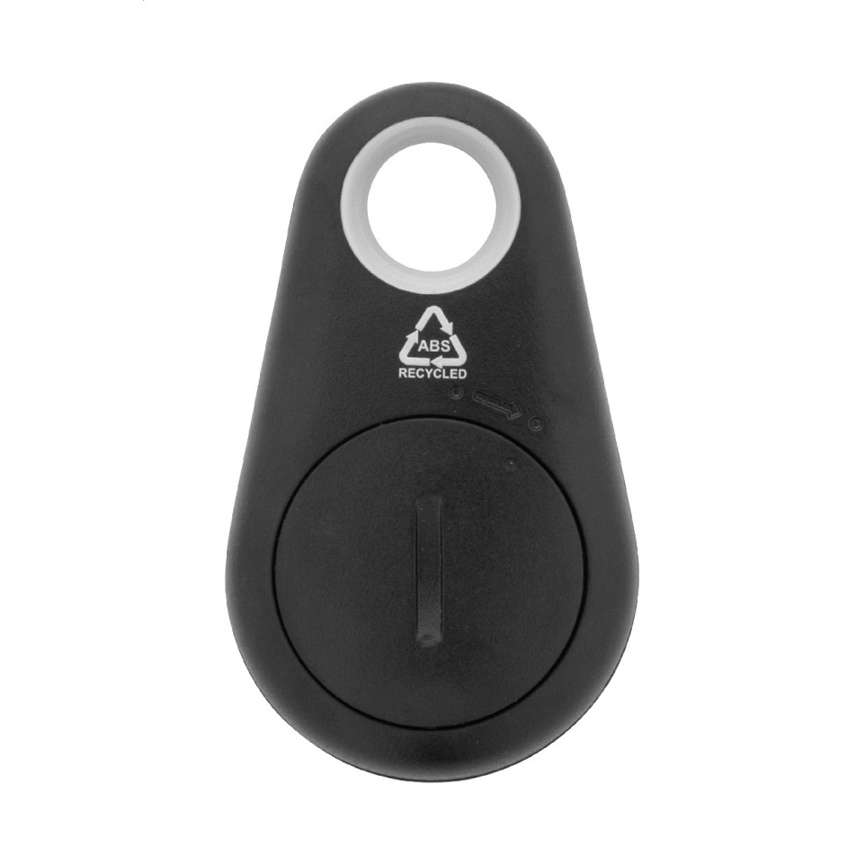 Wireless anti-lost key finder device for keys, bags, and other essentials. Features a built-in camera shutter, recycled ABS black housing, metal keyring, and button cell battery. Operates via free iOS and Android app for convenient tracking and remote activation.
