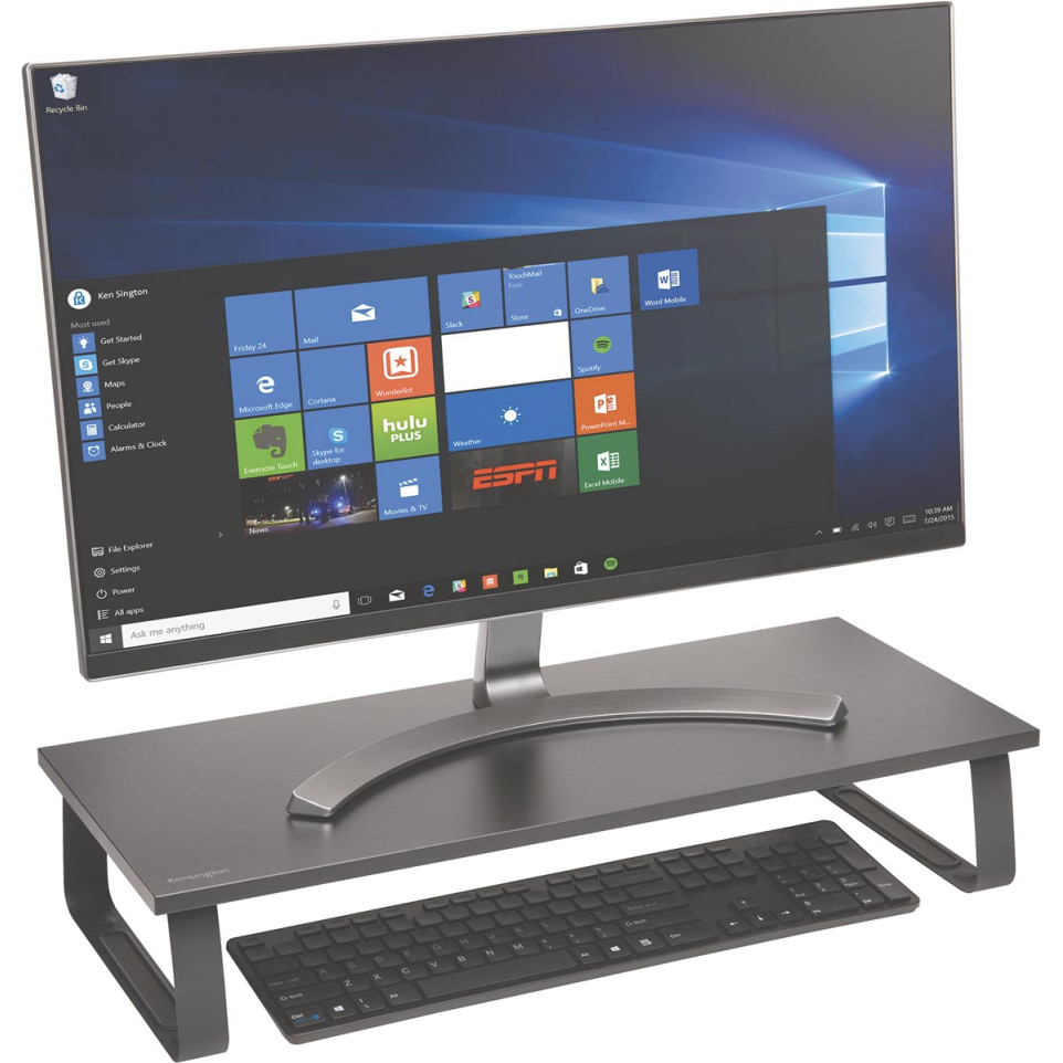 The Kensington extra large monitor stand elevates your screen to an ergonomic viewing height while its robust steel frame safely distributes weight across its extra-wide surface. Simply place your display on top and utilize the available storage space below for keyboards or accessories—assembly is not required before first use.