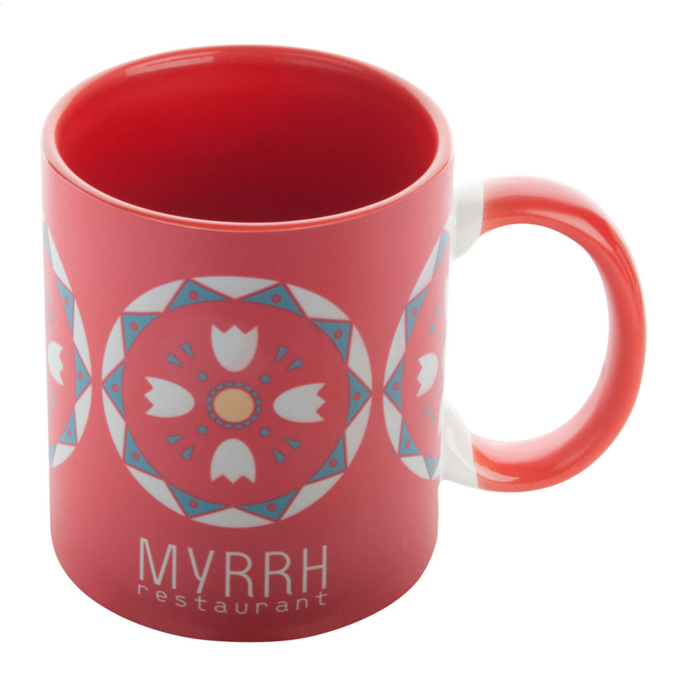 Ceramic sublimation mug featuring a vibrant red interior and matching handle, supplied in a gift box. With a capacity of 350 ml, this versatile mug is ideal for daily office use, promotional giveaways, or events.