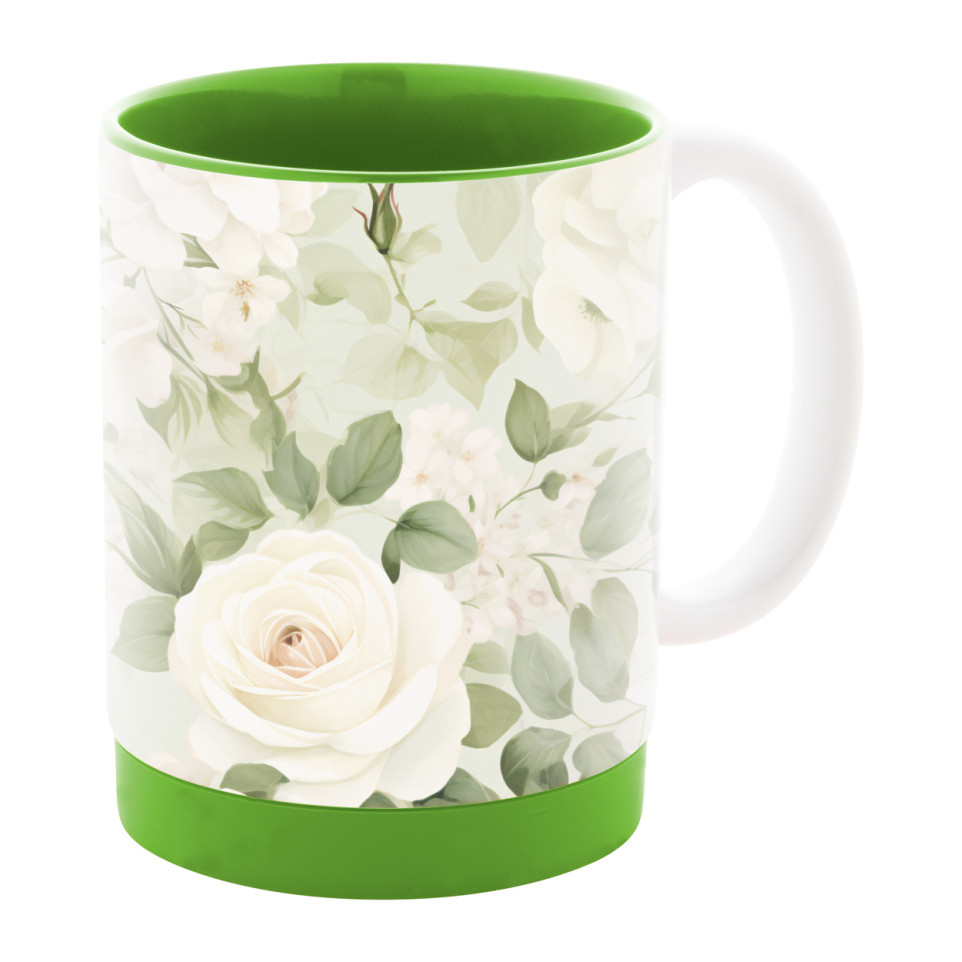 The MultiColour Plus green white sublimation mug combines elegant design with practical features. This 300 ml ceramic mug features a striking green interior and matching silicone ring at the bottom, creating a distinctive look for everyday use or special occasions.