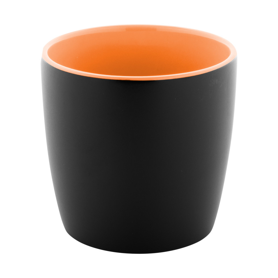 The Matara Nera orange black mug (AP800598-03) features a sophisticated dual-finish design with a matte black exterior and vibrant glossy orange interior. This high-quality ceramic mug holds 300 ml and comes elegantly packaged in an eco-friendly kraft paper box.