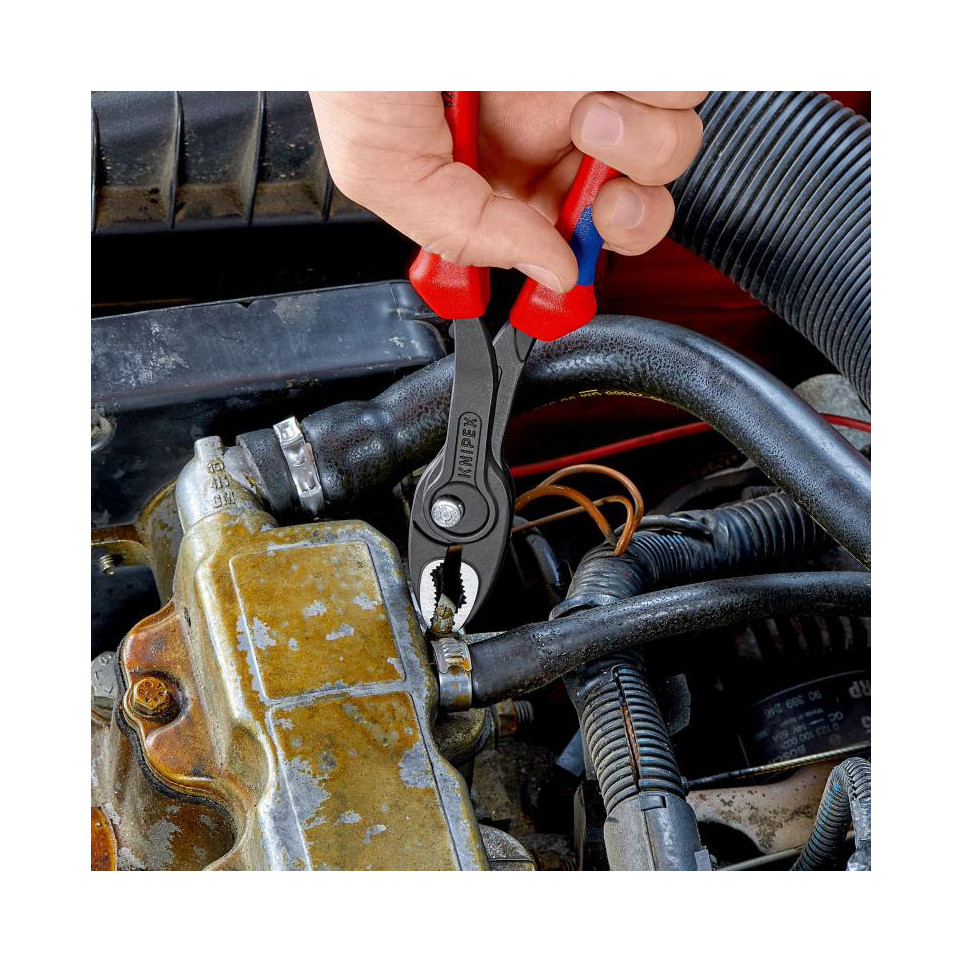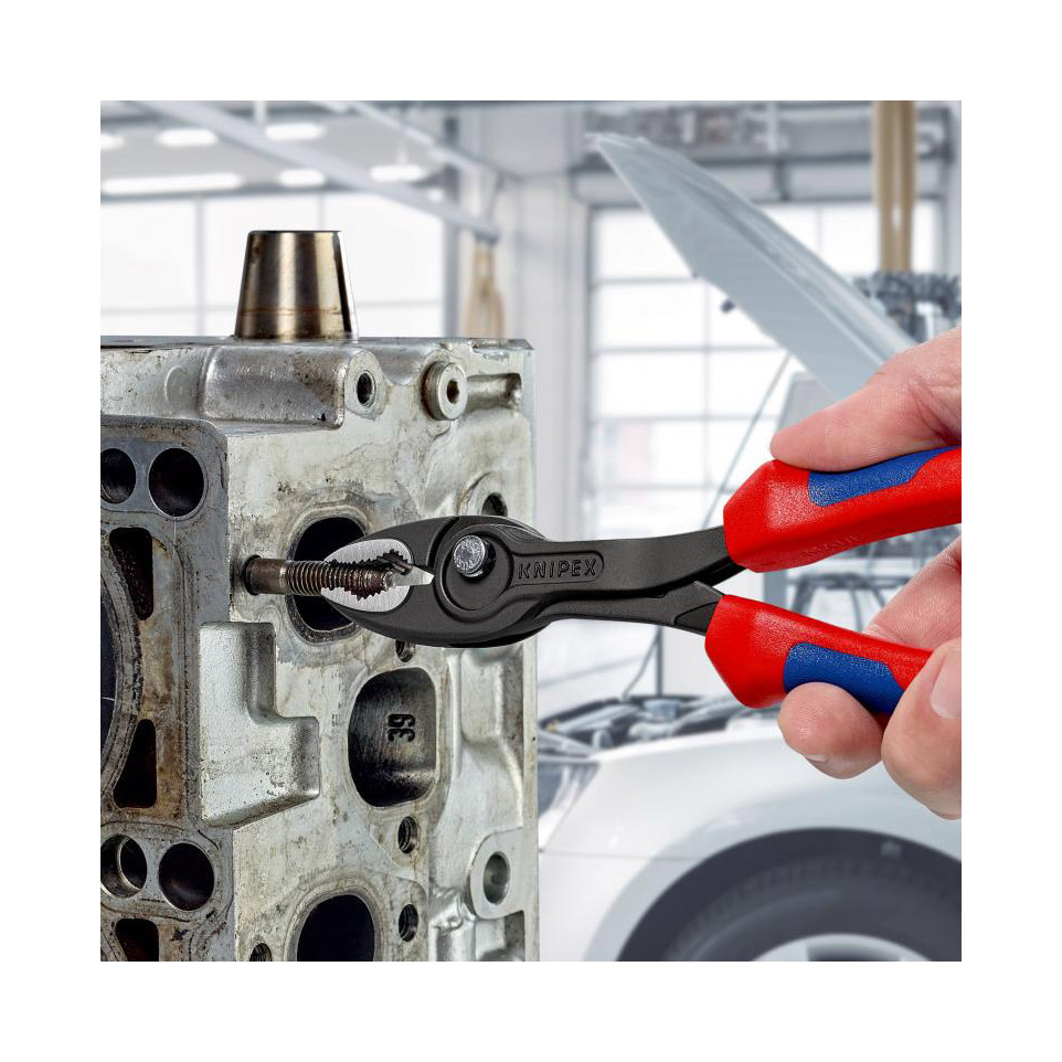 The Knipex TwinGrip front-jaw multipurpose pliers are designed for gripping, tightening, and loosening screws, nuts, and bolts—including those with worn heads—across a range of mechanical and assembly applications.