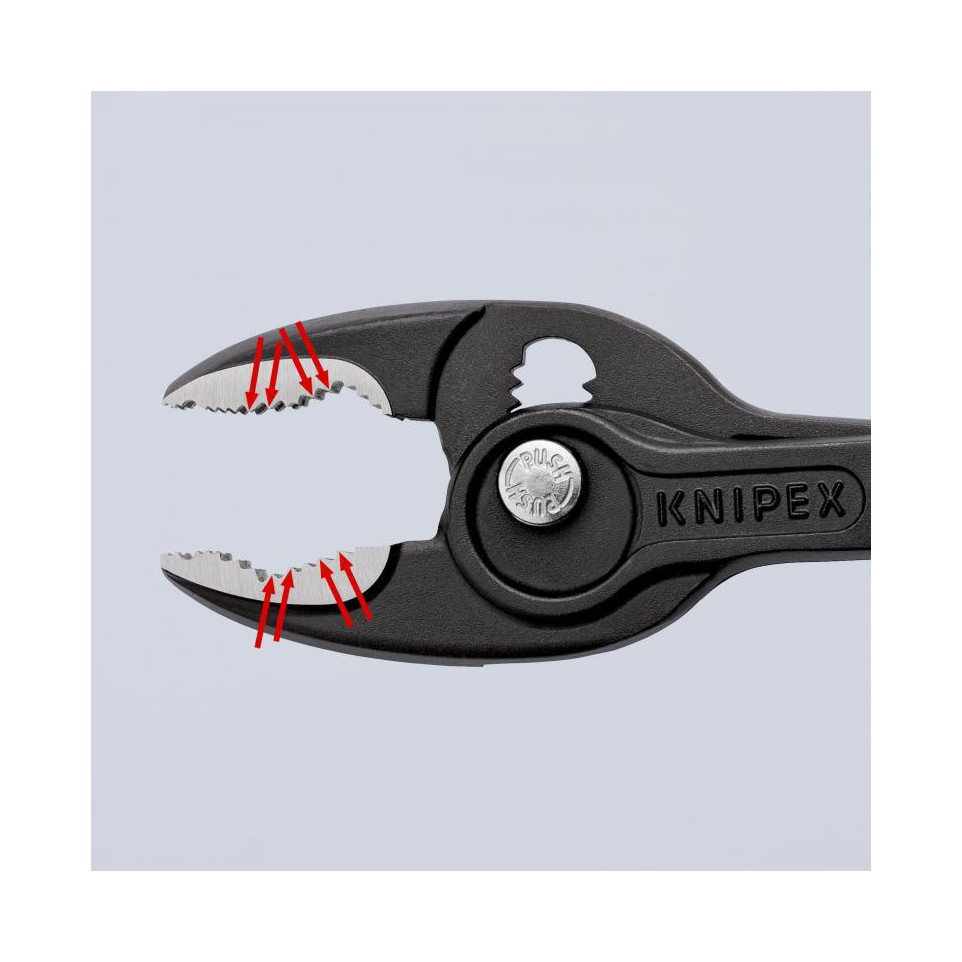The TwinGrip's jaws adjust easily via a push-button slip joint. Its unique jaw profile grips either from the front or side—facilitating removal or fastening even on worn components—while the slim head enables access within tight spaces.