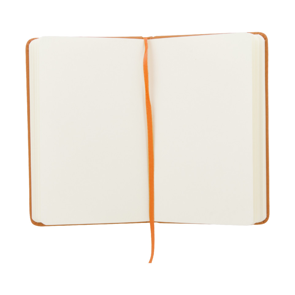 Nopuk Blank A6 orange notebook is a compact PU leather-covered journal featuring 100 blank sheets, a bookmark, and a rubber strap closure. Perfect for capturing ideas, sketches, or notes on the go.