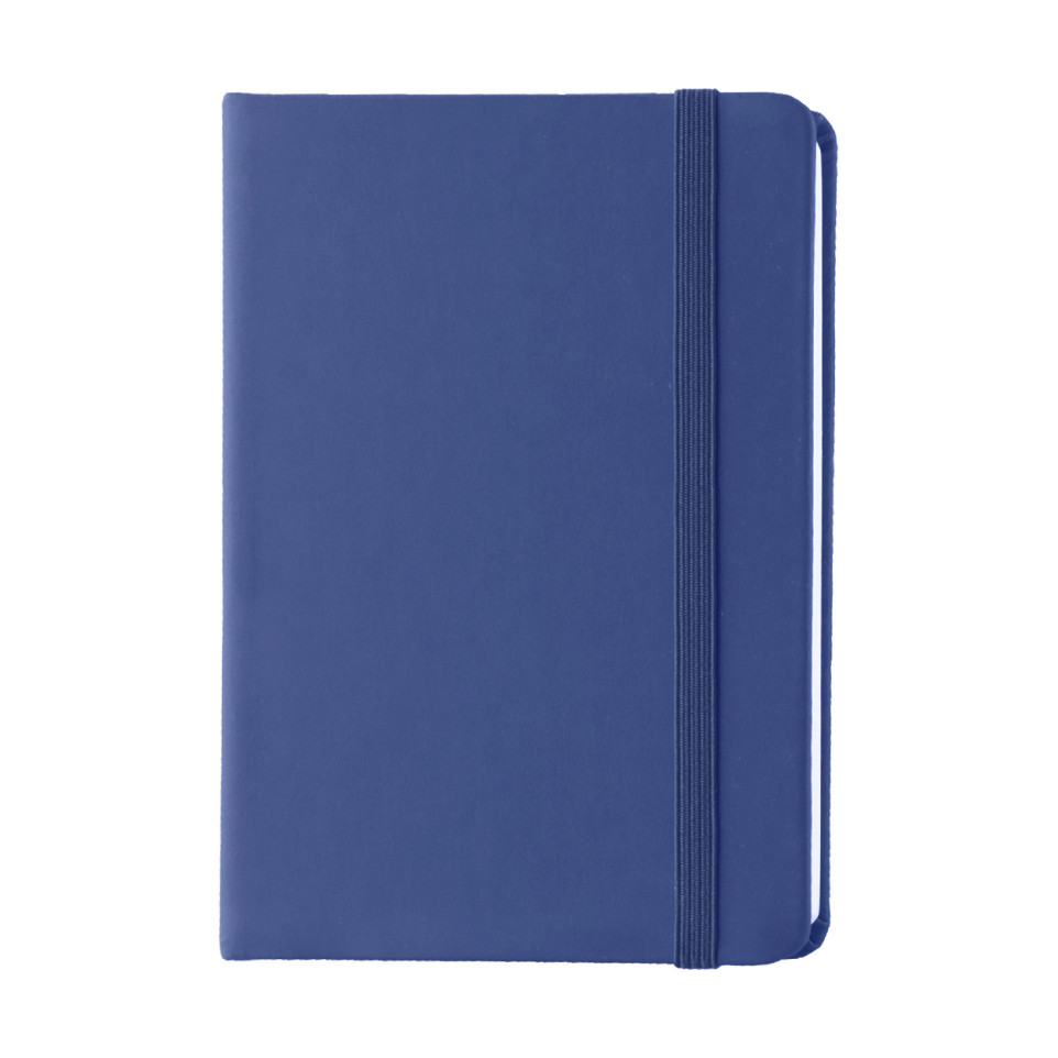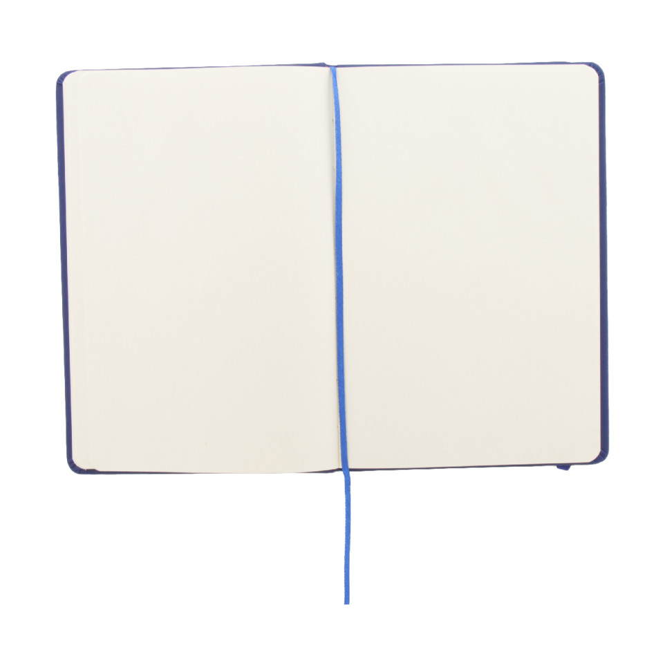 Compact A6 blue notebook featuring a PU leather cover, 100 blank sheets, an integrated bookmark, and a practical rubber strap. Designed for daily notes, sketches, or professional organization, it fits easily in bags and pockets.