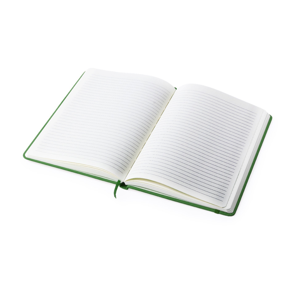 The Nopuk Line A5 green notebook features a PU leather cover, 100 lined sheets, and a secure rubber strap. Its A5 format makes it practical for meetings, notes, or daily planning in any professional or personal context.