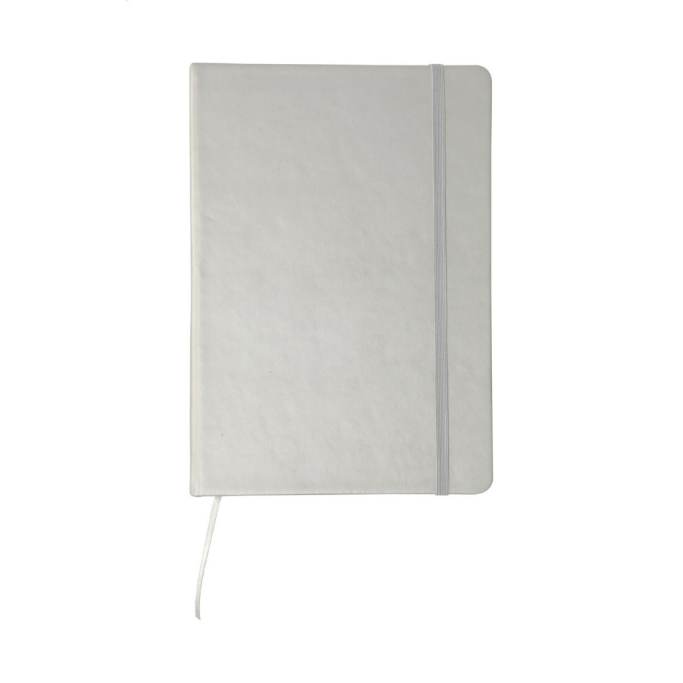 The Nopuk Blank A5 silver notebook is a compact, stylishly designed notebook featuring 100 blank sheets, a PU leather cover, integrated bookmark, and a secure rubber strap—suited for note-taking, sketching, or professional organization in any setting.