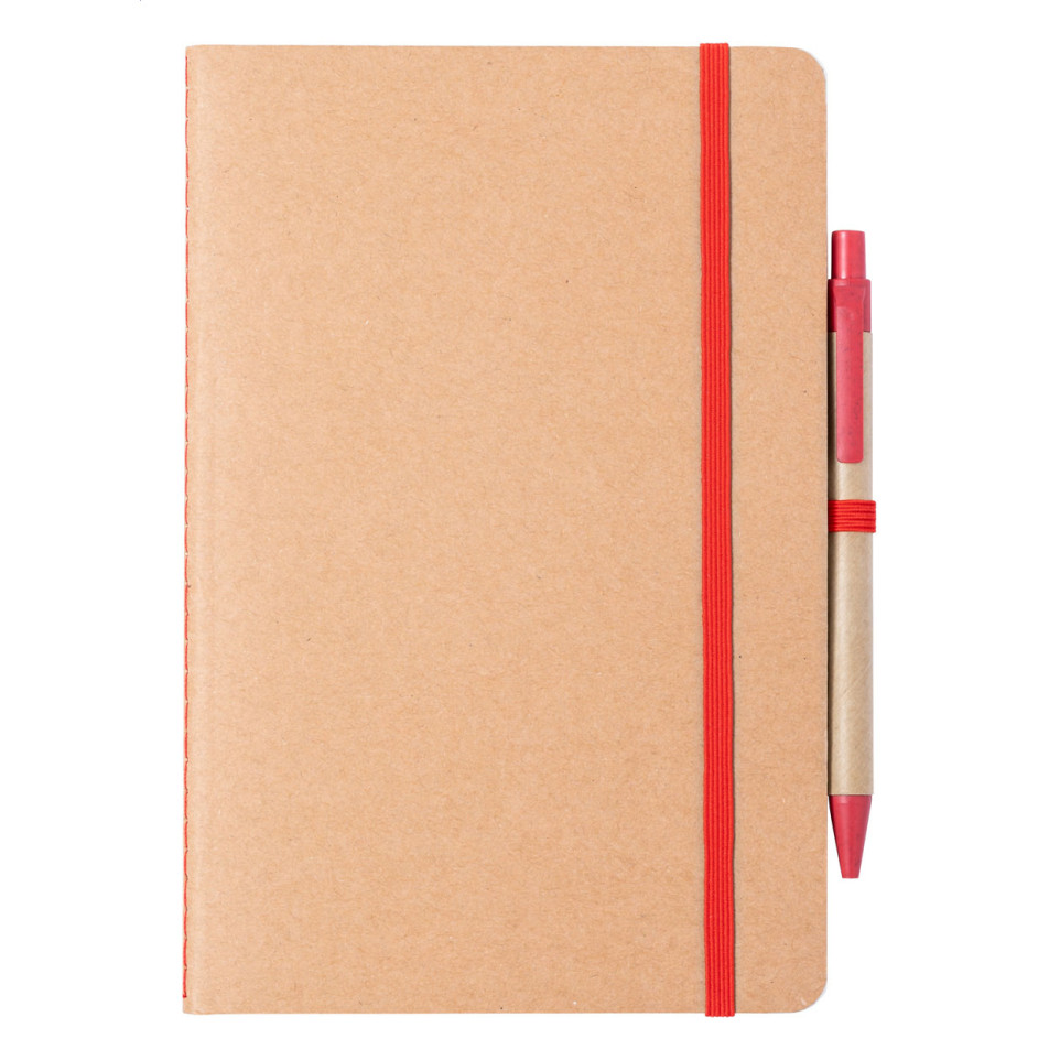 The Ginkgo red natural notebook is an A5-sized notebook with a recycled cardboard cover, 60 blank sheets, and a colored elastic strap closure. It includes a wheat straw plastic ballpoint pen with blue ink, making it ideal for everyday note-taking at work, school, or meetings.