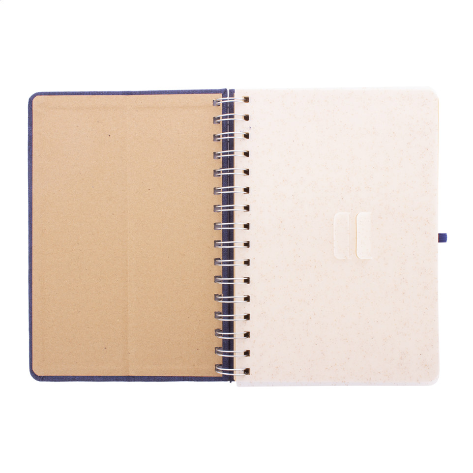 A5 format spiral notebook with a cover made from recycled RPET polyester, featuring a mobile and tablet holder crafted from wheat straw plastic. Includes 70 lined sheets in recycled kraft paper, a rubber closure strap, and a pen holder. Suitable for meetings, note-taking, or daily organization in office and mobile work environments.