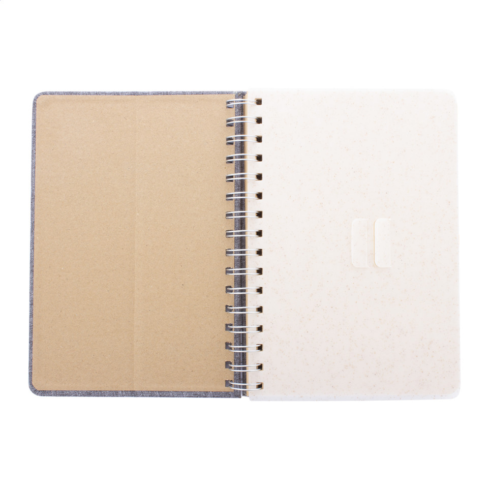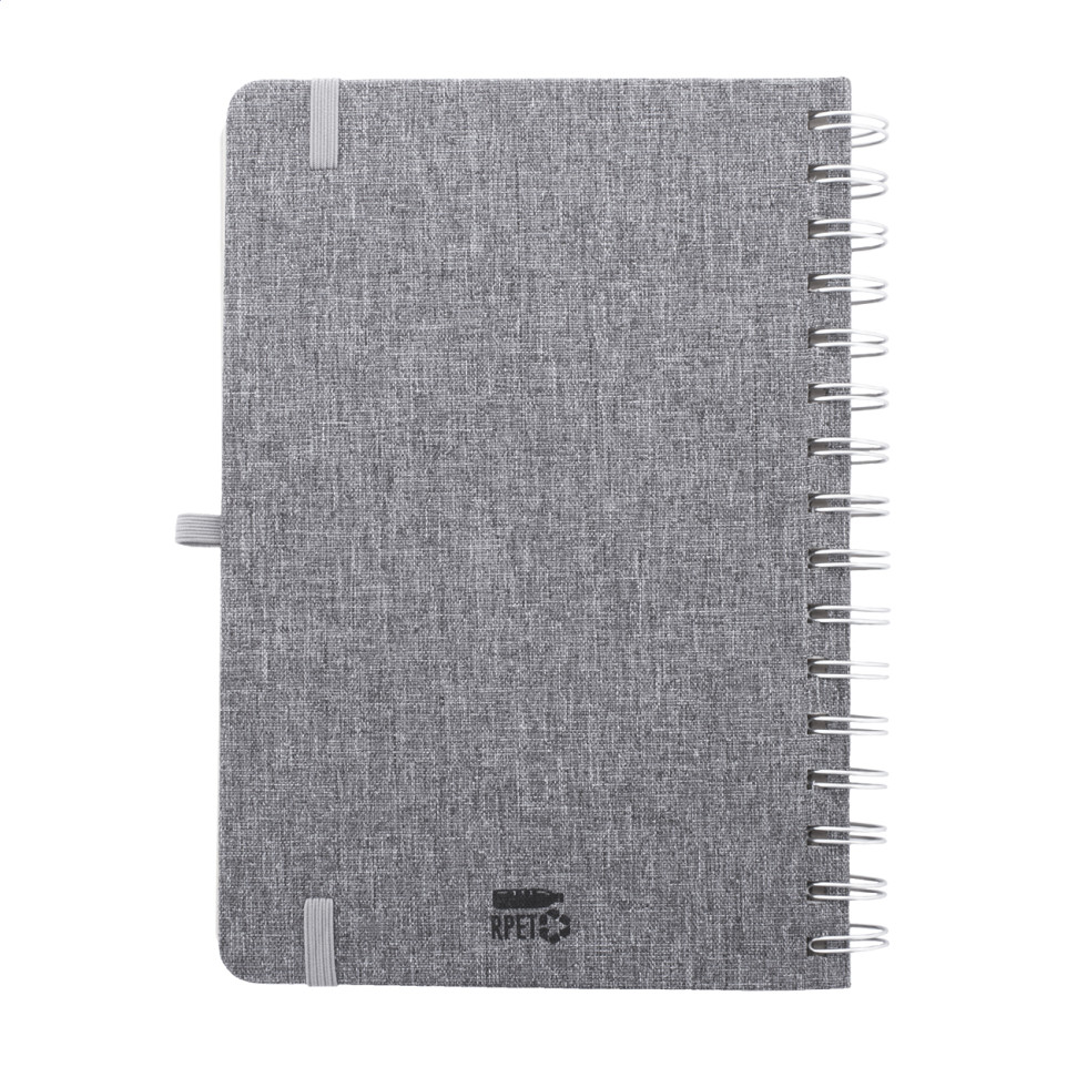 The Holbook grey RPET notebook is a sustainable A5 spiral-bound notebook featuring a polyester cover made from recycled PET materials. It includes an innovative wheat straw plastic holder for mobile devices and tablets, making it ideal for professionals and students who need to take notes while referencing digital content.