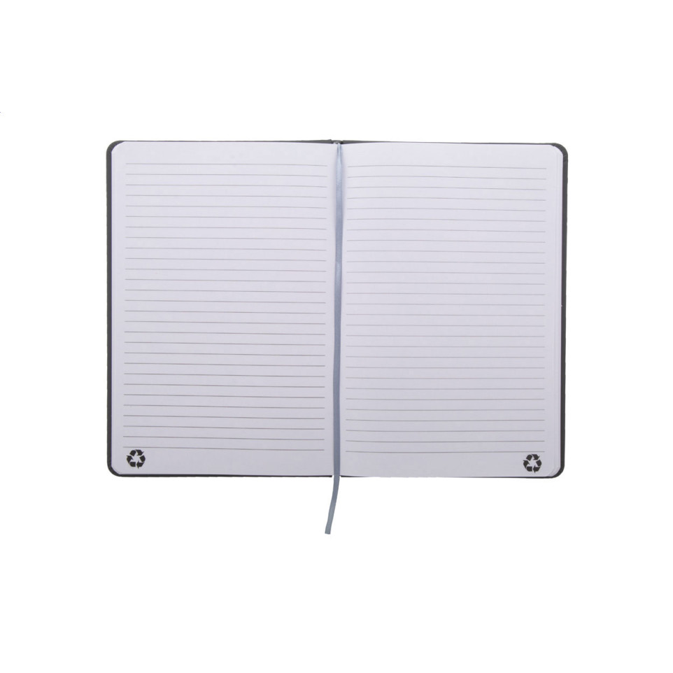 Eco-friendly A5 notebook covered in recycled PU leather featuring 100 lined recycled paper sheets. Complete with a coordinating bookmark and elastic closure strap for secure organization on the go.