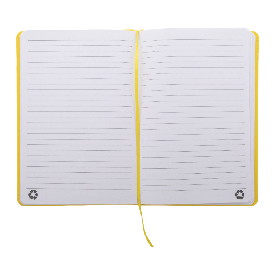The cover is made of recycled PU leather, and the inner sheets are recycled paper.