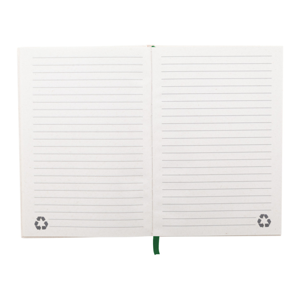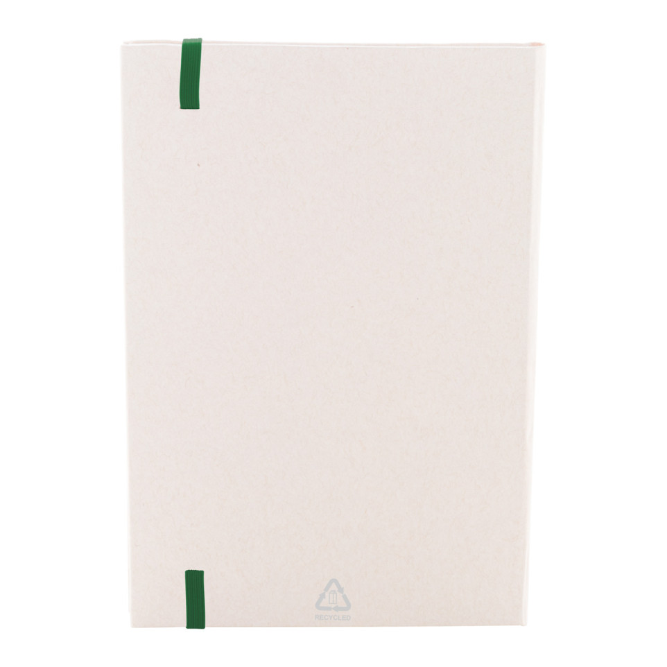 - Made from recycled milk carton paper, featuring a hard cover in green and a coordinating elastic band