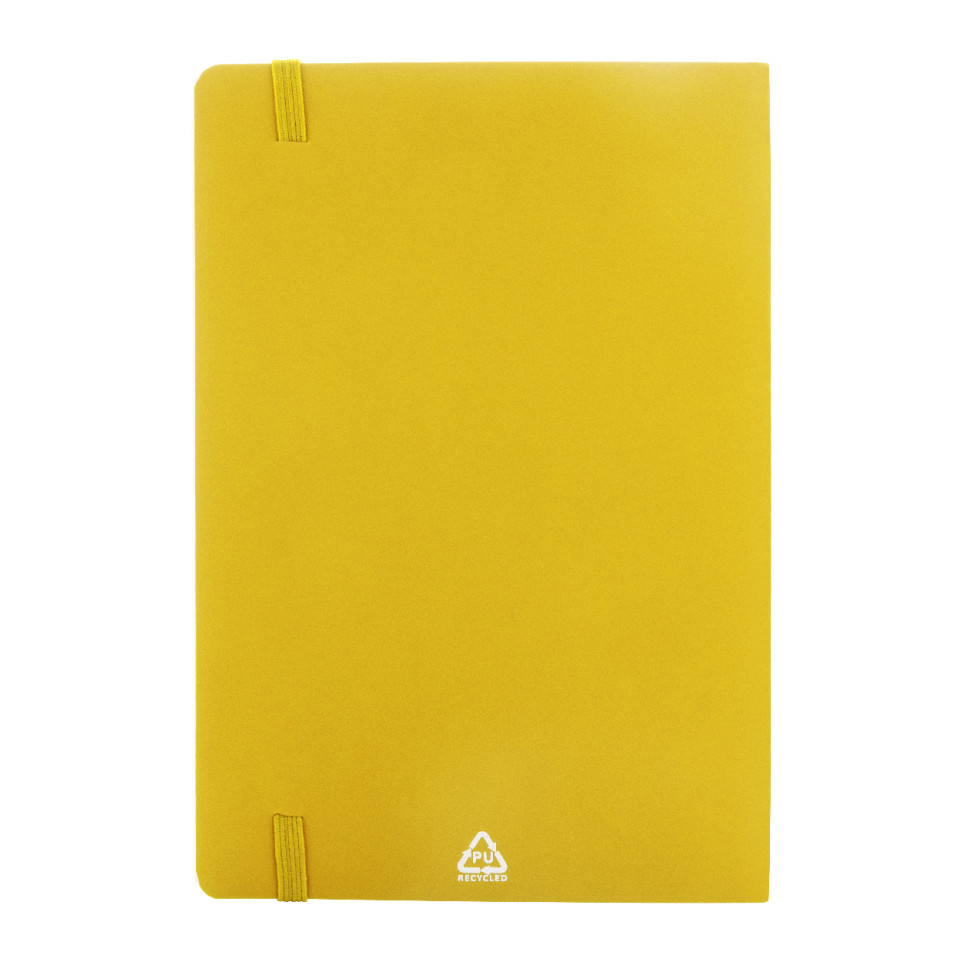 Repuk Soft A5 yellow RPU notebook combines sustainability with practicality. This soft-cover notebook features 80 lined sheets of recycled paper, complete with a matching yellow bookmark and elastic closure band in a convenient A5 format.