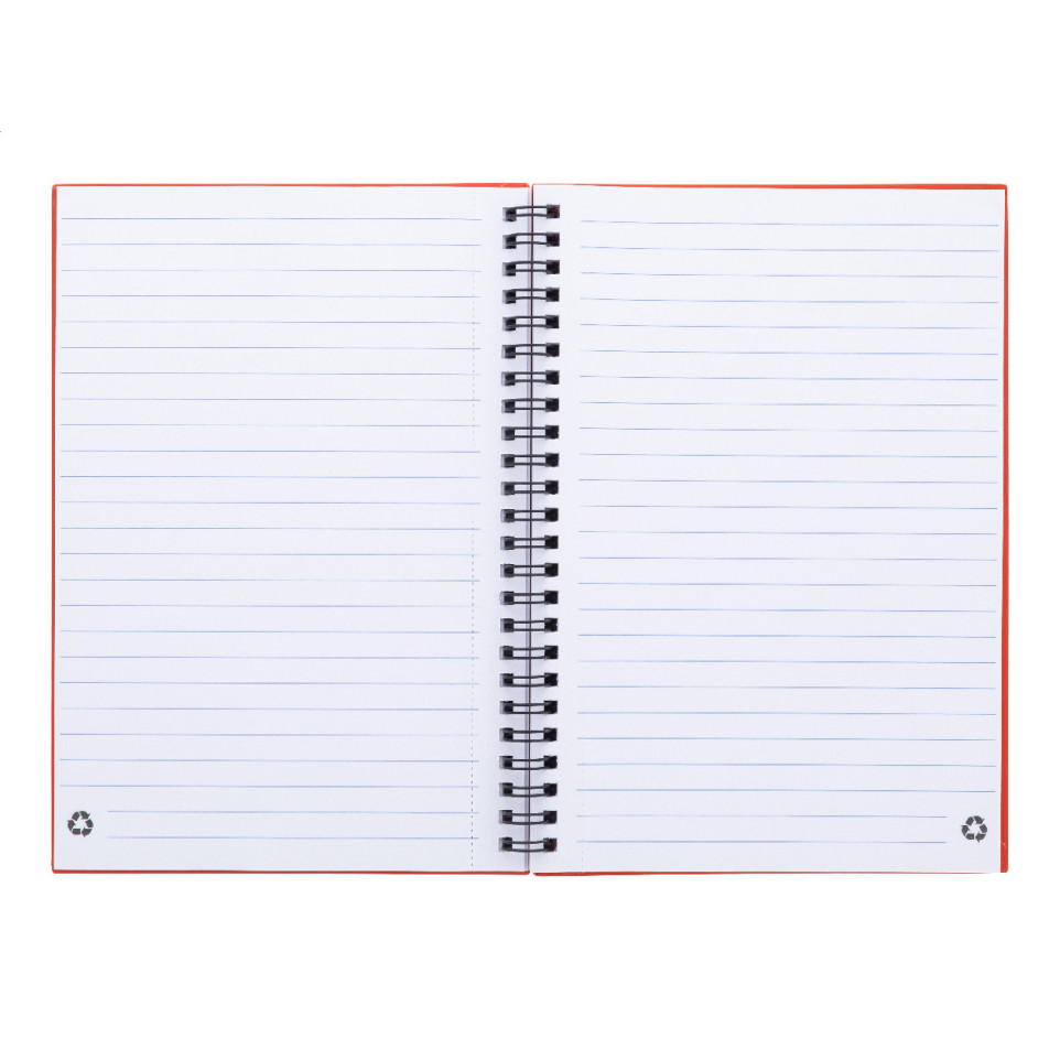 The Strobus A5 red notebook is a compact, spiral-bound notebook featuring 80 lined sheets of recycled paper, ideal for notes at home, school, or the office.