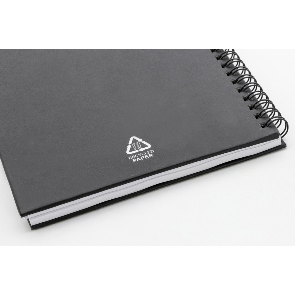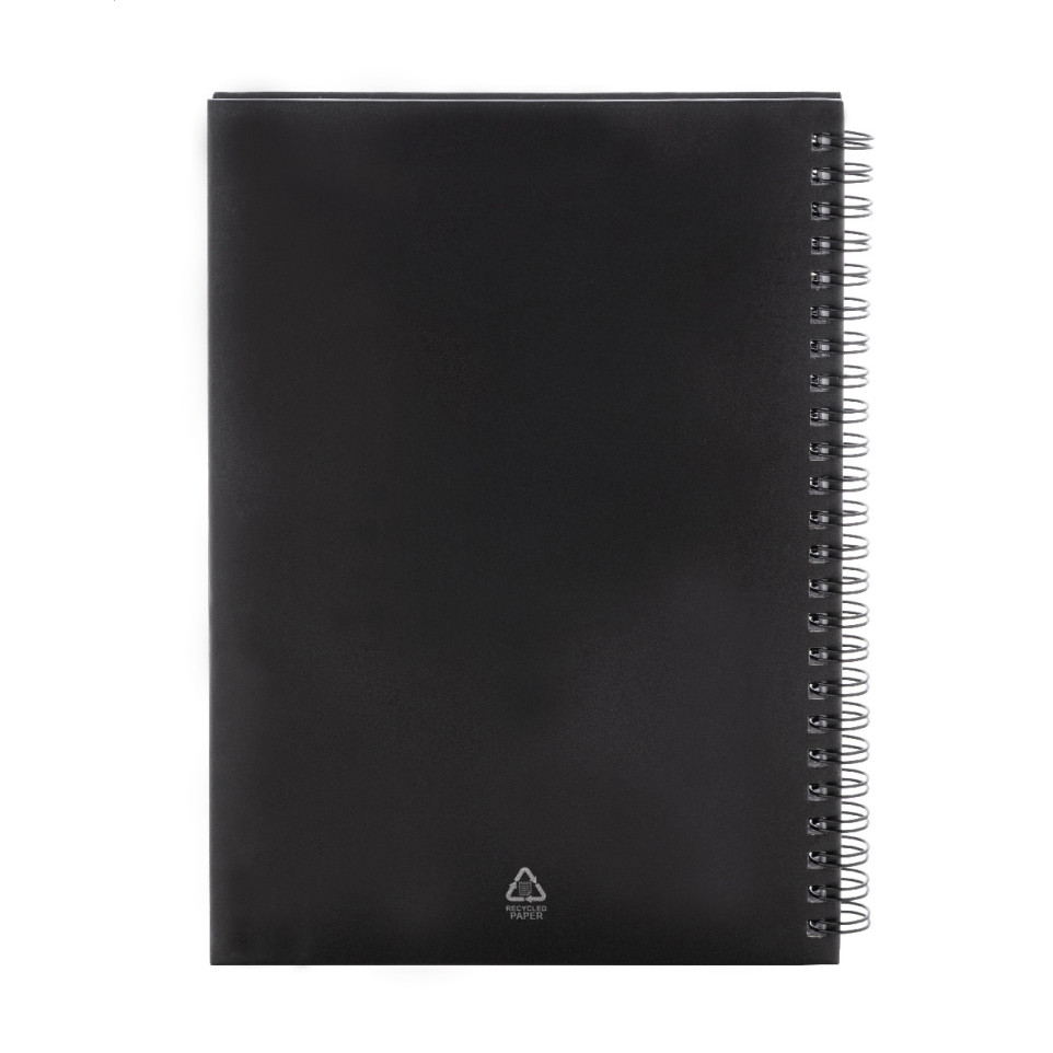 A compact A5 black spiral notebook with a recycled paper cover, featuring 80 lined recycled paper sheets. Ideal for daily notes in the office, school, or fieldwork while supporting sustainable practices.