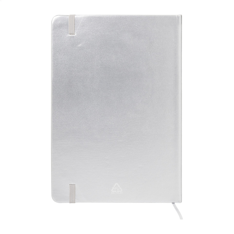 • Metallic finish recycled PU leather cover with matching silver bookmark and rubber band; A5 size.