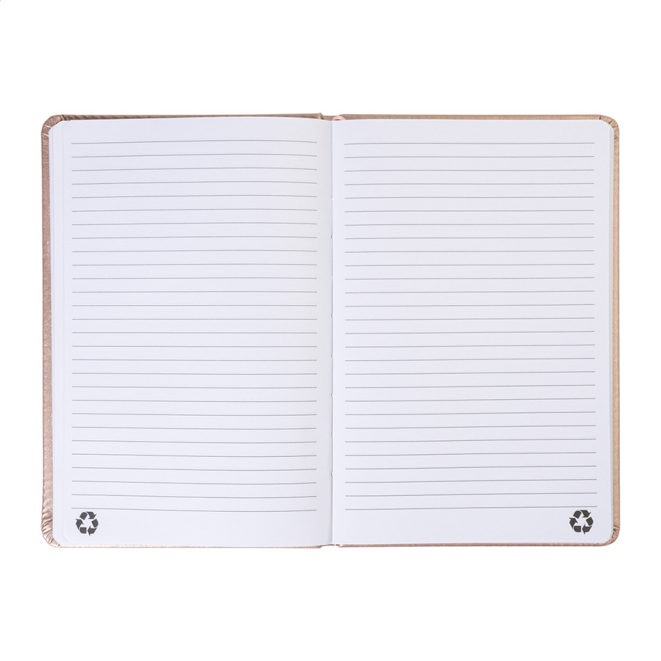 A5 recycled PU leather notebook with a metallic rose finish, designed for everyday note-taking, journaling, or professional use, combining style with sustainable materials.
