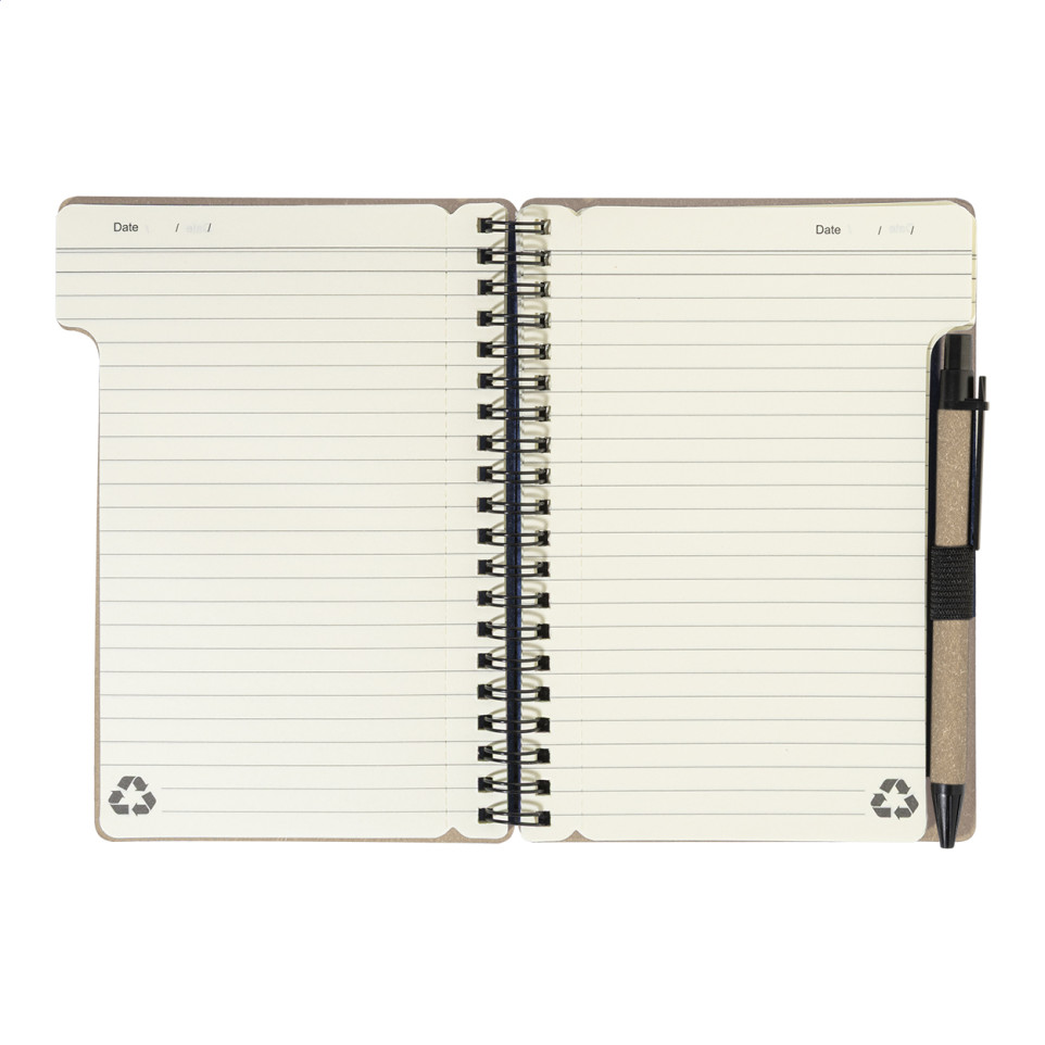 Recycled paper spiral notebook in A6 size with 80 lined sheets, including a matching recycled PP ballpoint pen with blue refill. Ideal for everyday note-taking, meetings, or on-the-go planning.