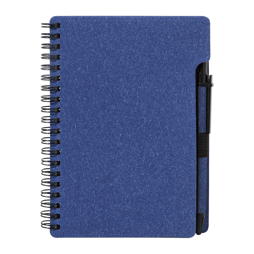 Compact spiral notebook crafted from recycled paper with 80 lined sheets in A6 format. Includes matching recycled paper ballpoint pen with blue refill for convenient note-taking on the go.