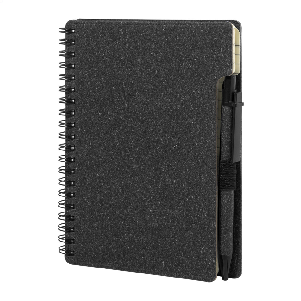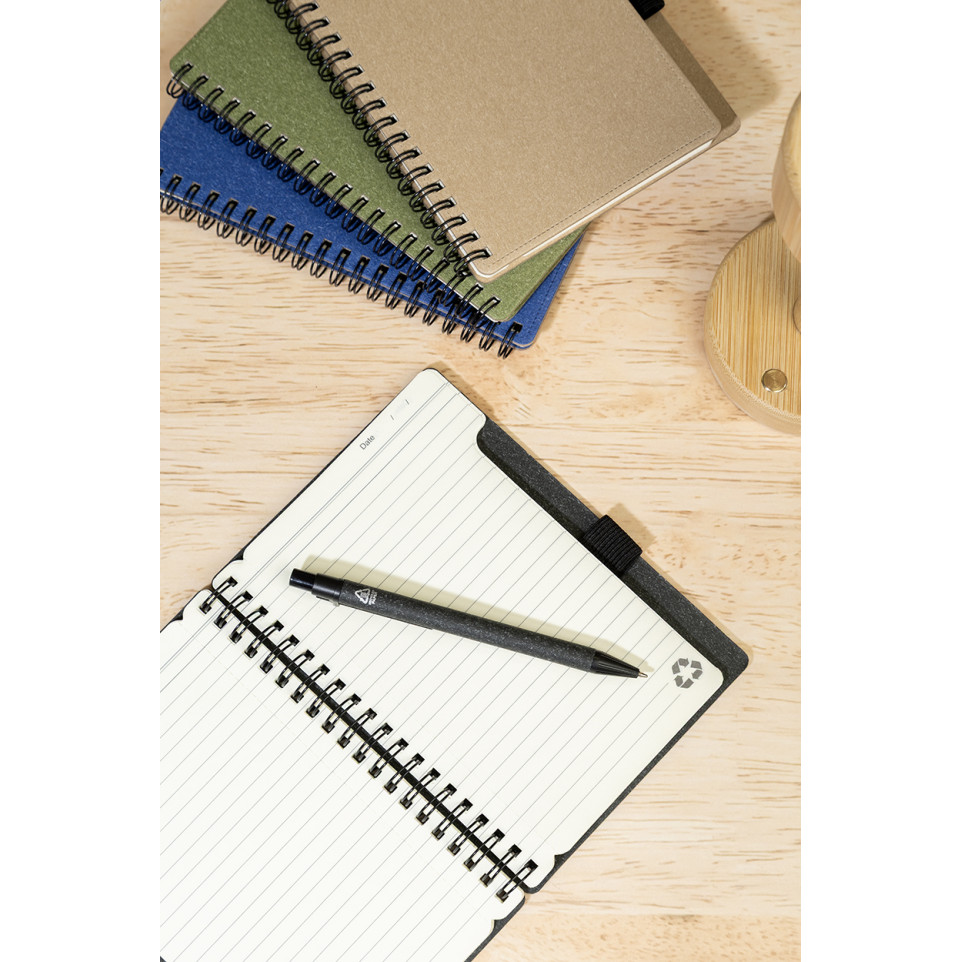 Is the notebook made from sustainable materials? Yes, both the notebook and accompanying ballpoint pen are manufactured from recycled paper and recycled polypropylene respectively.