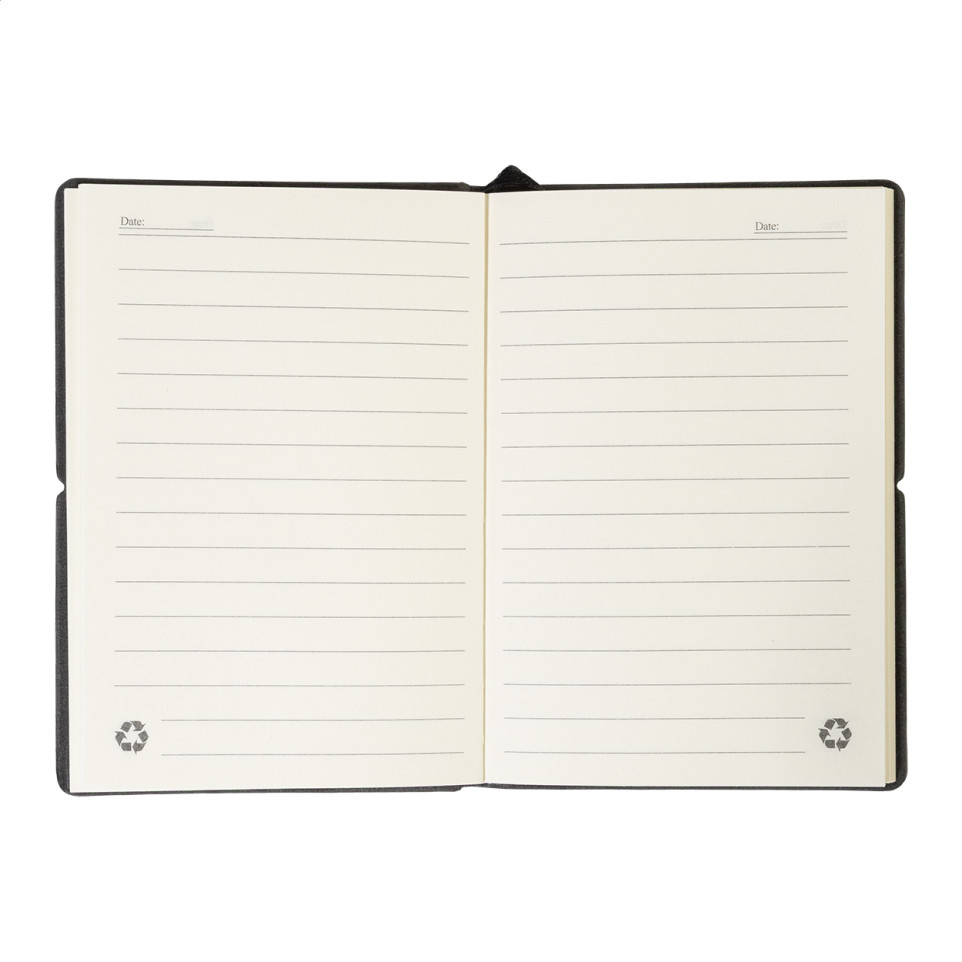 A compact A6 notebook covered in recycled PU leather, combining lined recycled paper sheets with practical organizational accessories for everyday note-taking and planning.