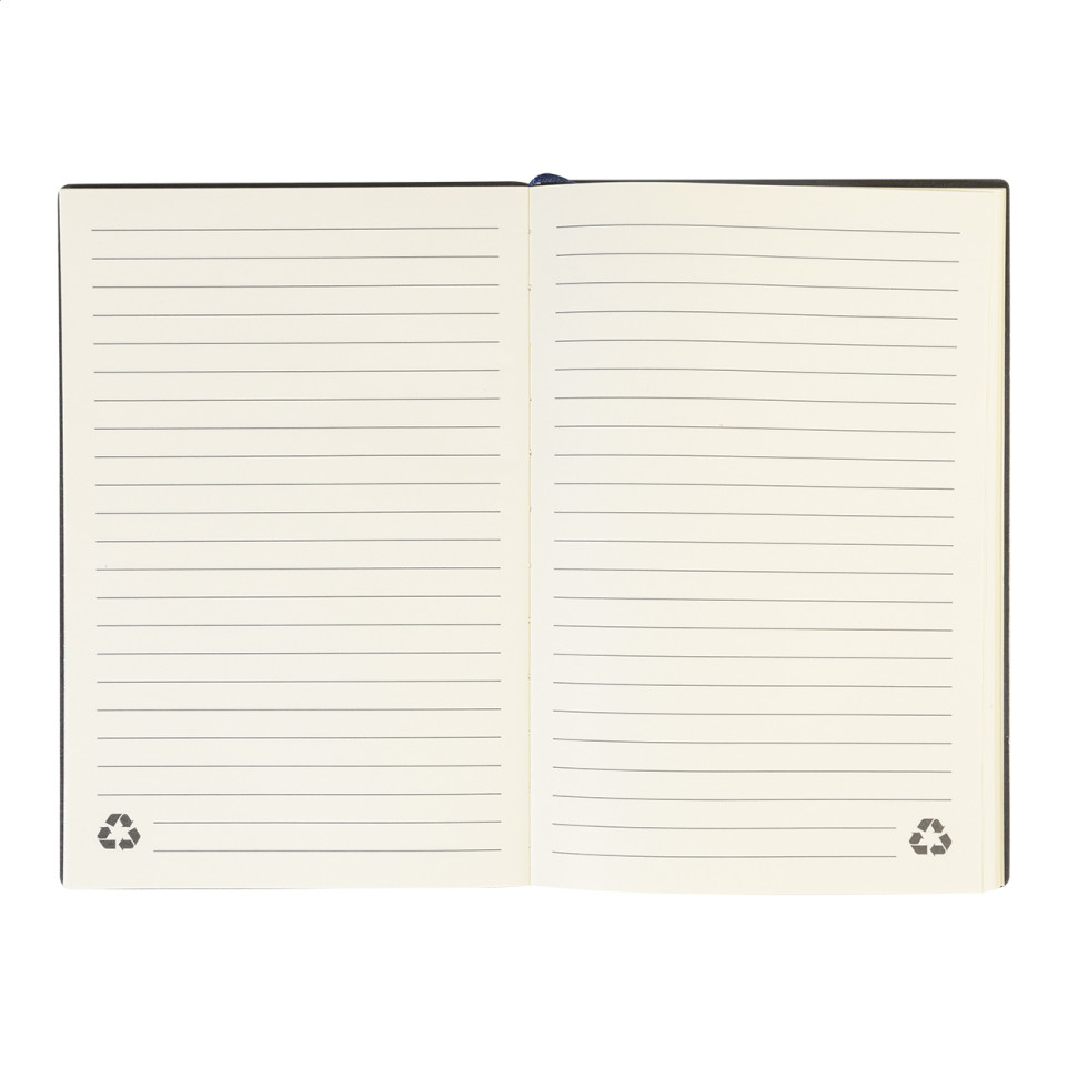 What paper quality should I expect? - The notebook features lined recycled paper that supports standard pen writing and provides adequate thickness to prevent ink bleed-through during regular note-taking.