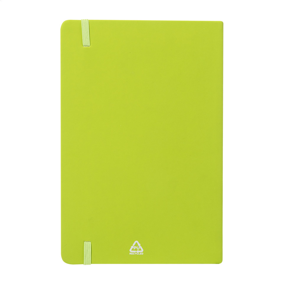 • Recycled PU leather cover, recycled paper sheets at 70 g/m², and rubber band