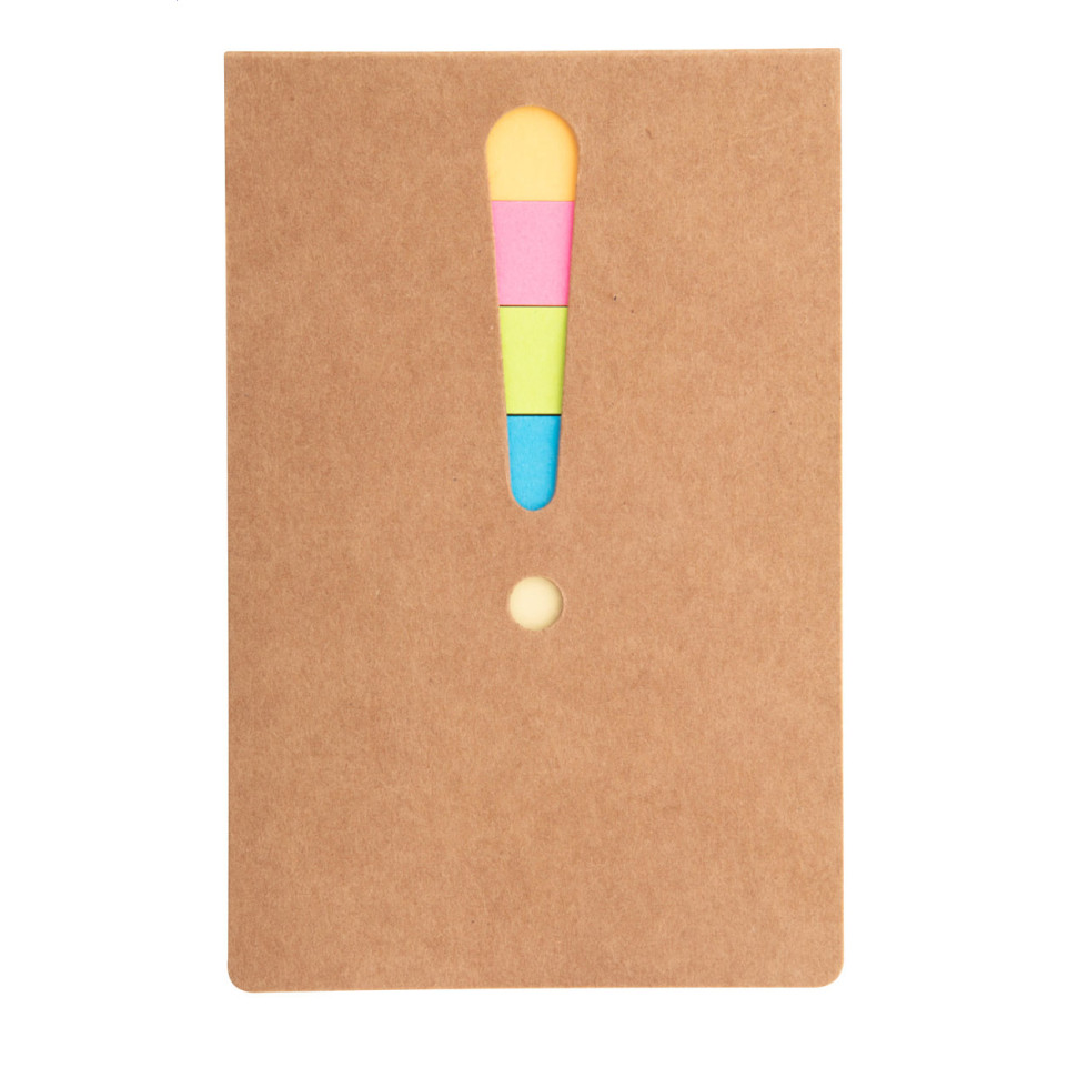 This Exclam sticky notepad features a distinctive die-cut exclamation mark on its beige cover, combining 25 full-size notes with 100 colorful page markers in four different colors, perfect for organizing thoughts and highlighting important information in office or academic settings.
