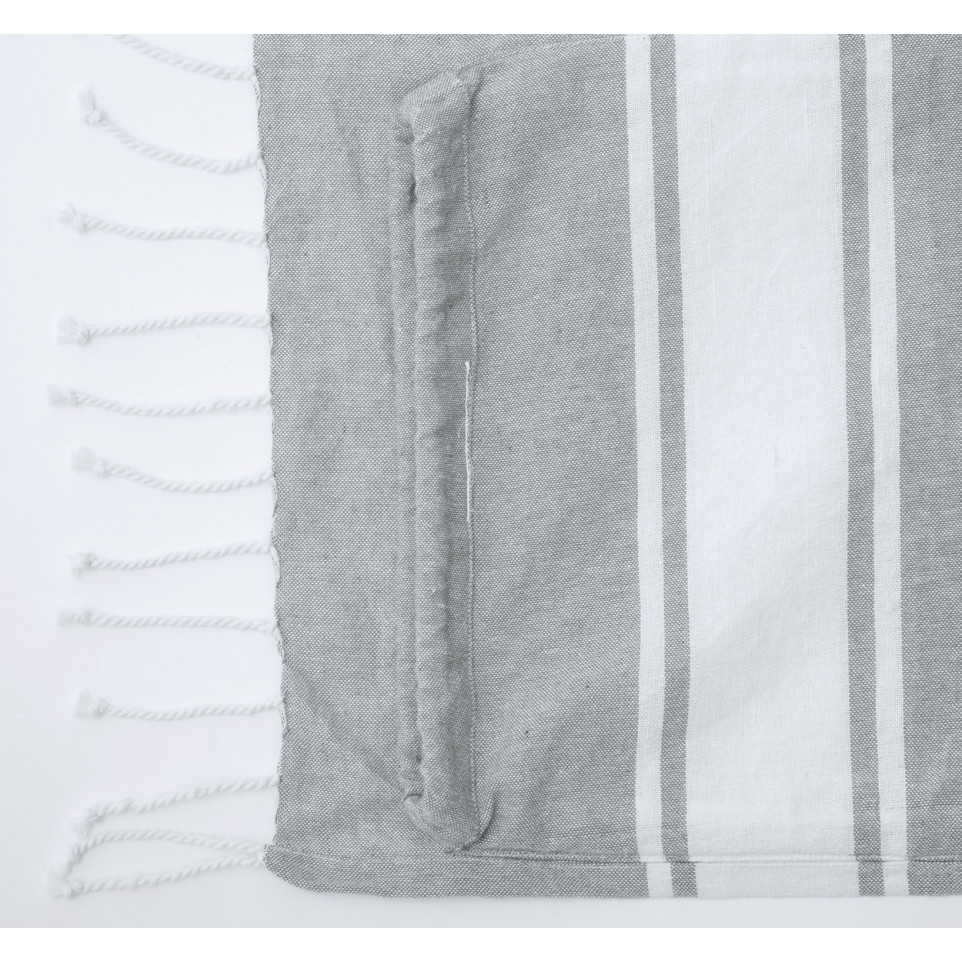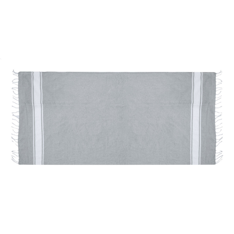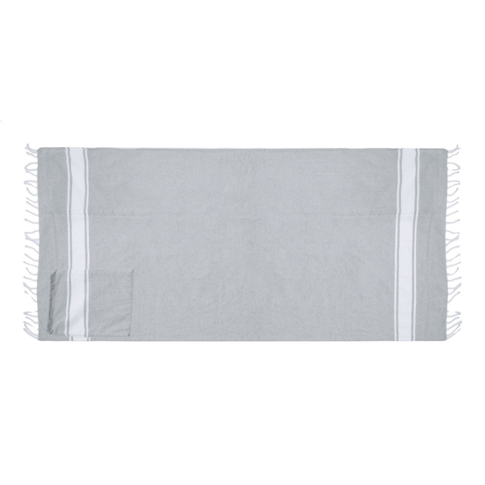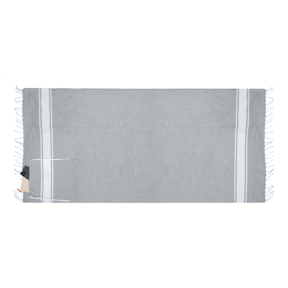 The Praia grey beach towel and drawstring bag set combines functionality with eco-conscious design. This two-tone pareo style towel comes with a matching drawstring carry bag, perfect for beach outings, pool days, or outdoor activities.