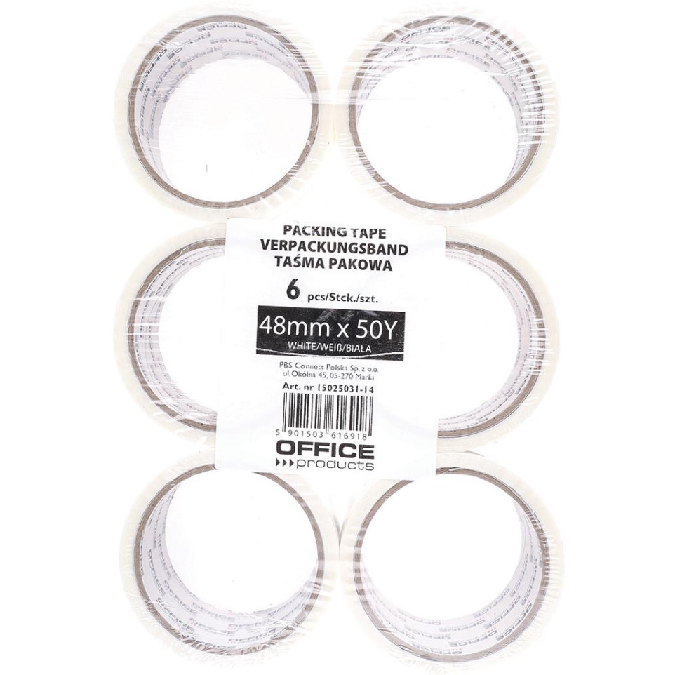Office Products packaging tape features a 48 mm x 46 m roll of white polypropylene tape with acrylic adhesive, designed for general-purpose packaging and sealing applications across home, office, and shipping needs.