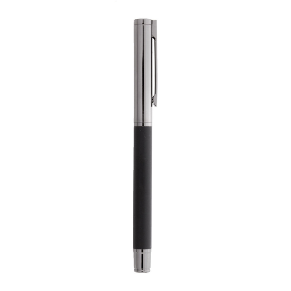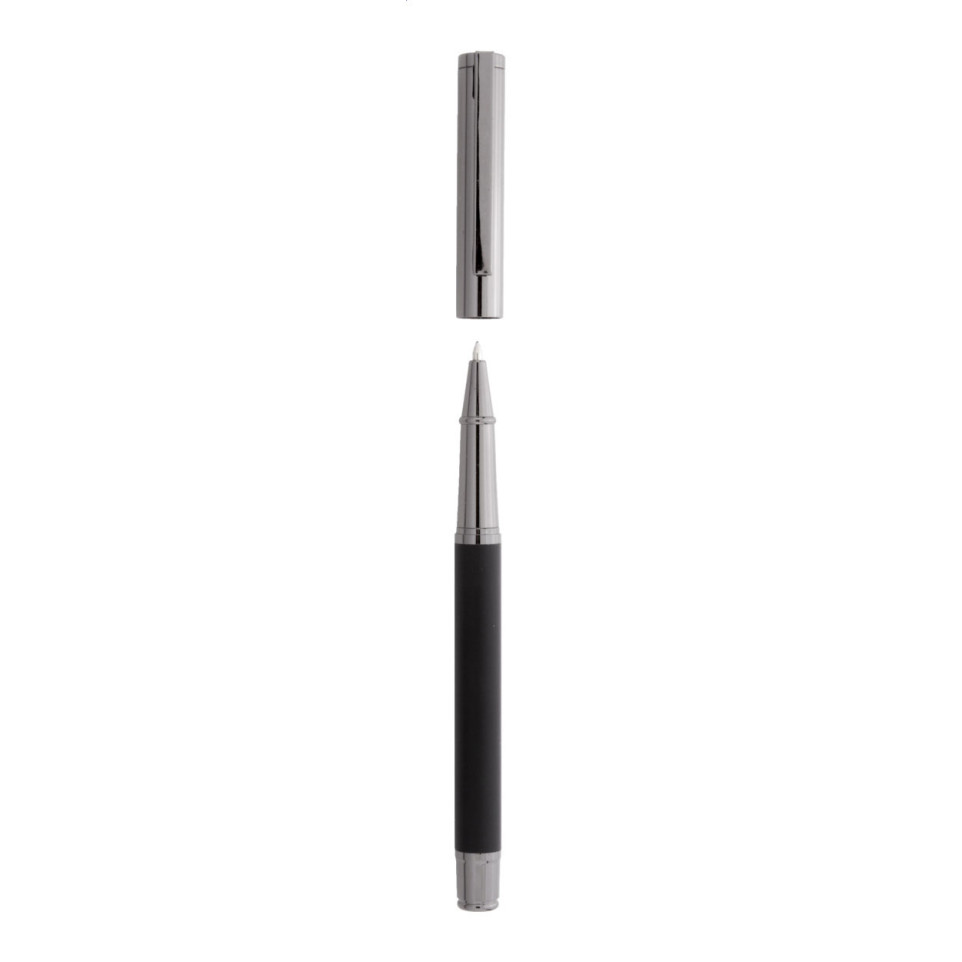 Elegant metal pen set featuring a ballpoint pen and roller pen, presented in a sleek black paper gift box. This sophisticated writing instrument duo comes with blue refill ink for immediate use.