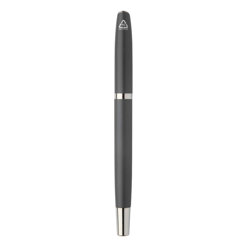 Elegant recycled aluminum pen set featuring both a roller and ballpoint pen, presented in a sophisticated black paper gift box. A sustainable writing solution that combines functionality with eco-conscious design.