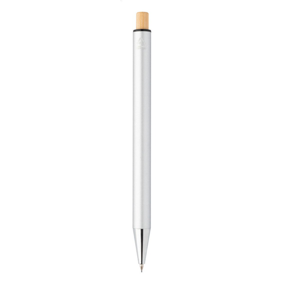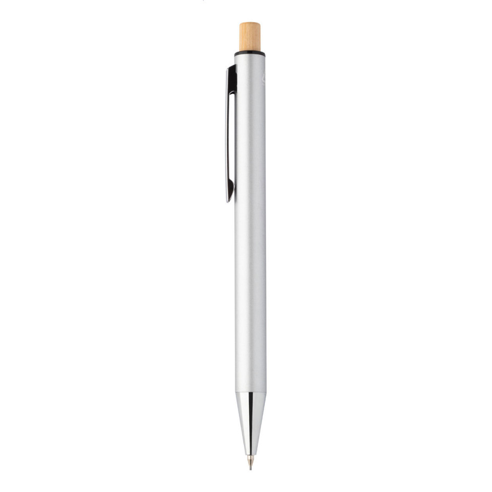 Ralbo silver pen set combines a recycled aluminium ballpoint pen with blue refill and a mechanical pencil with 0.7 mm leads, each featuring bamboo push buttons. Both writing instruments are presented in a natural kraft paper box, ideal for office or gift use.