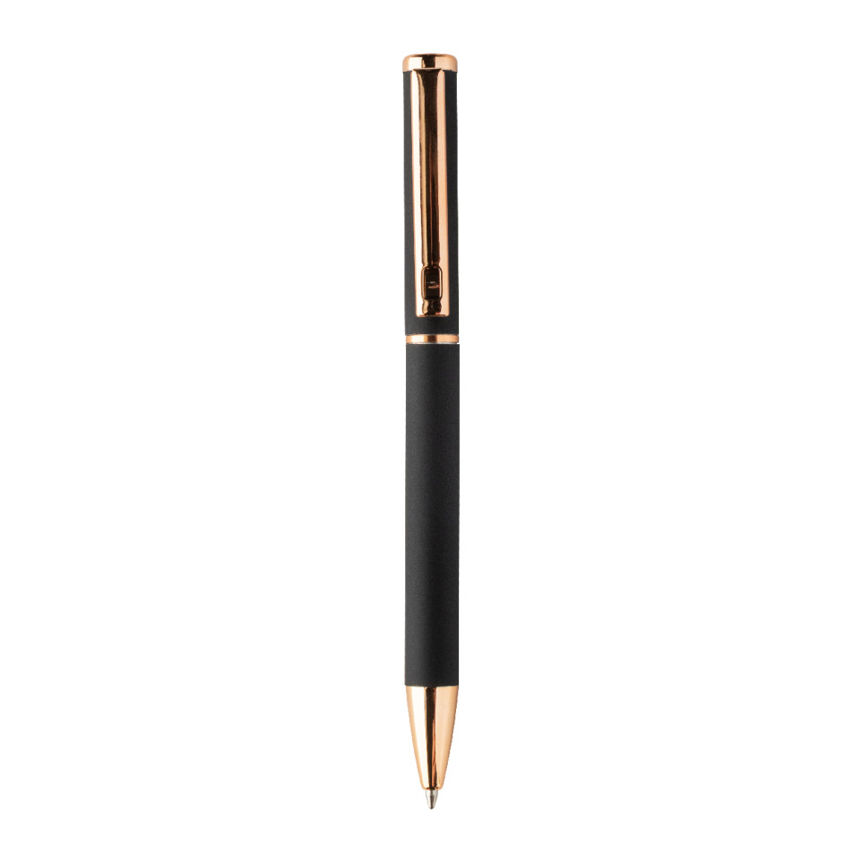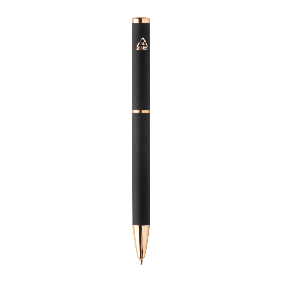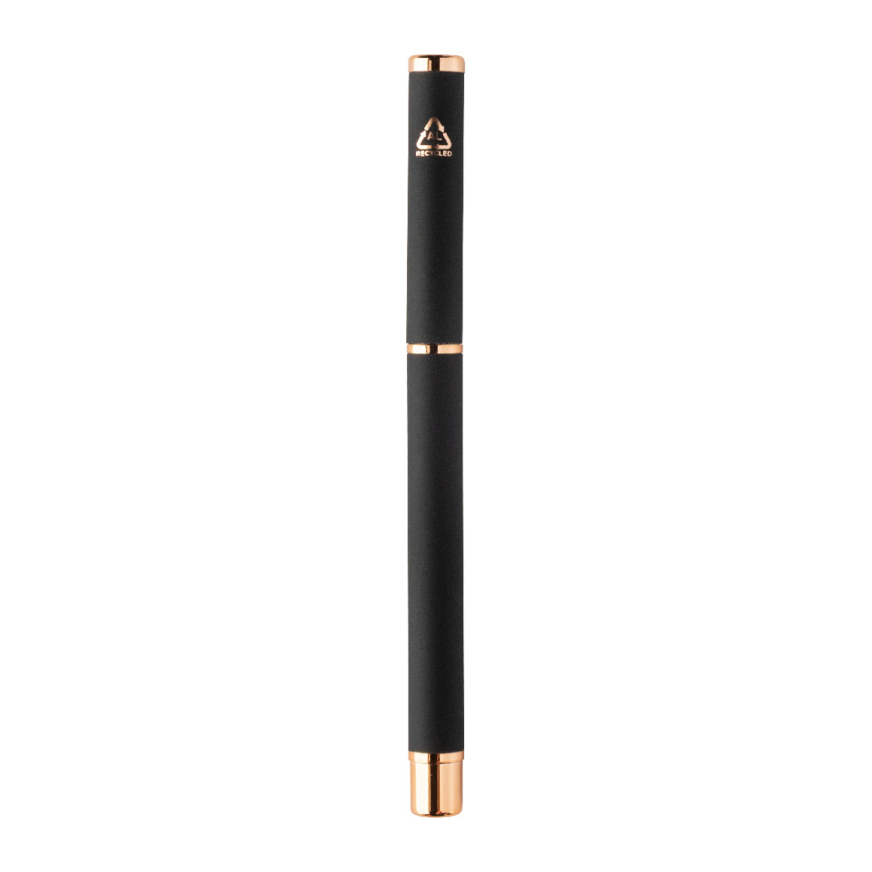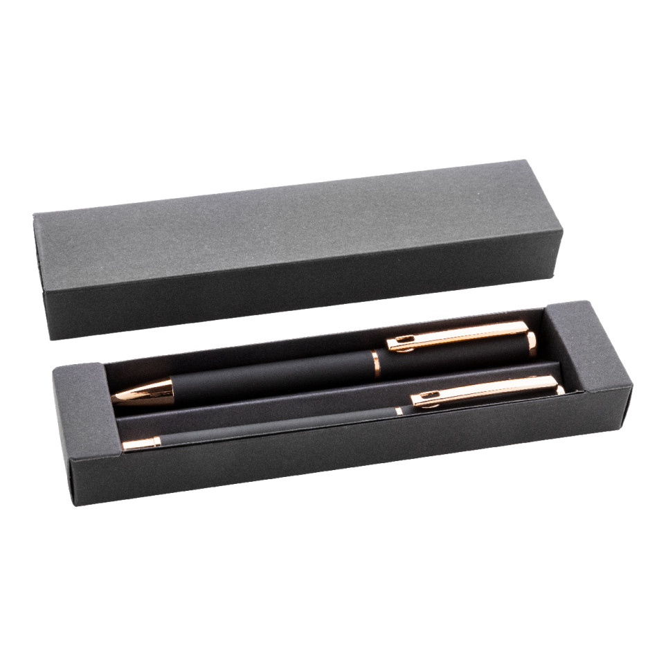 Rossy black pen set includes a recycled aluminum ballpoint pen and roller pen, both with a rubberized finish and elegant rose gold detailing. Supplied with blue ink refills, it arrives in a sleek black paper gift box—ideal for everyday writing or gifting.