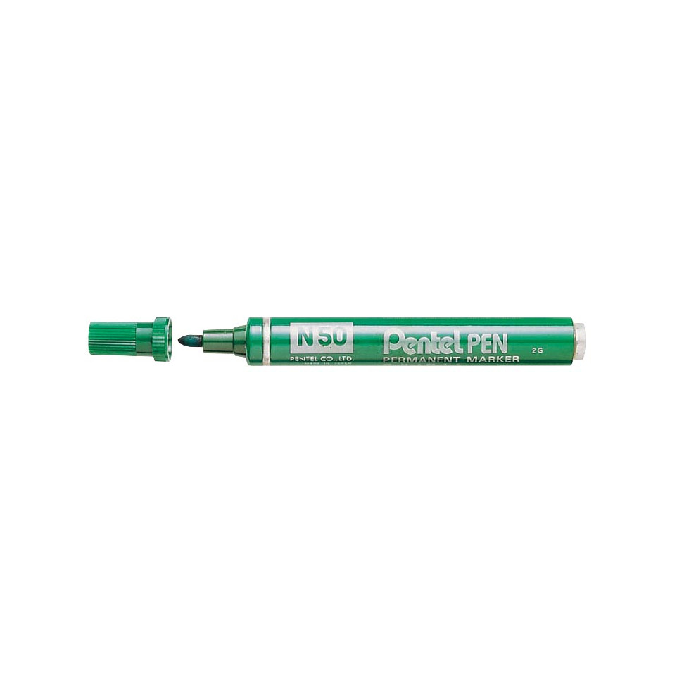 The Pentel marqueur permanent Pen N50 vert is used for marking various surfaces, including cardboard, metal, plastic, wood, and glass, in both indoor and outdoor conditions.