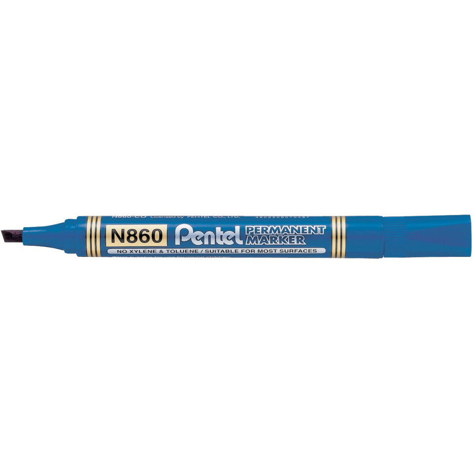The Pentel N860-C Permanent Marker in blue features a chisel tip for versatile marking on virtually any surface. Its robust design and quick-drying permanent ink make it suitable for office, industrial, and home use.