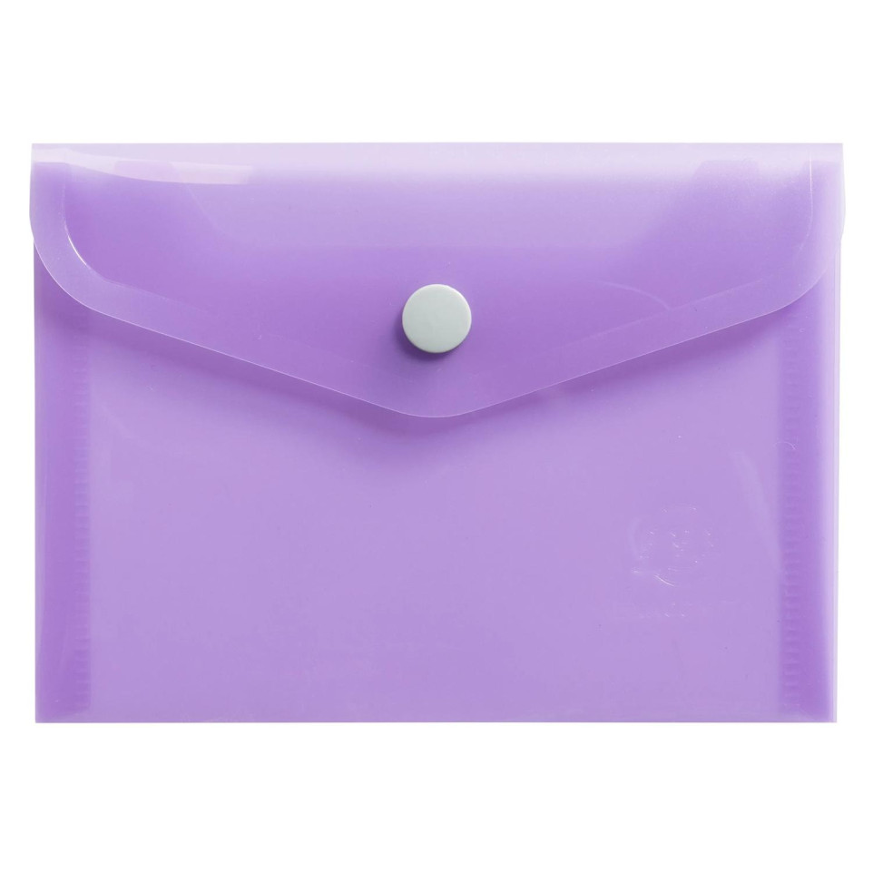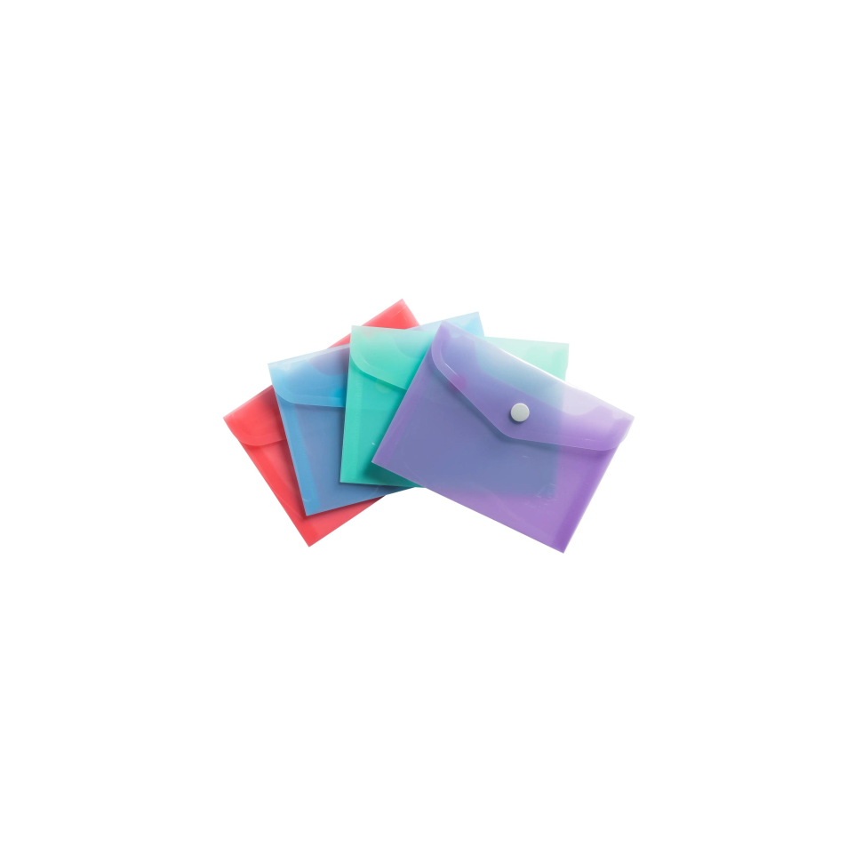 Exacompta Chromaline Pastel PP Press Stud Pocket B6 Durable and flexible plastic organiser pockets with a translucent finish and press stud button closure for storing notepaper and smaller items, Zen inspired minimalist design in soft pastel colours for a calm and organised home or office. These clear stationery supplies and document pouches are ideal for storing and transporting smaller items, Use as a pencil case, coin or money bag, a travel organiser to store cards and tickets, or as a flash card holder for revision. Practical B6 size pop wallet designed to hold up to 50 sheets of 80gsm paper, The high quality press stud closure keeps the contents secure and easy to access, Daily essentials will stay organised and protected in bags, drawers or on a desk. Durable poly pockets designed to withstand daily use, Made from flexible wipe clean and waterproof polypropylene to keep the folder and it's contents in perfect condition, Ideal for office stationery, school notes or general storage at home. Pack of 4 pockets including 1 x coral, 1 x green, 1 x blue, and 1 x purple, Matching products are available in the Chromaline and Aquarel Collections for a peaceful and harmonised home, office or school.