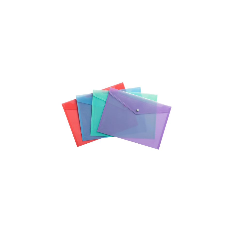 Exacompta Chromaline Pastel PP Press Stud Pocket A4 Durable and flexible plastic organiser pockets with a translucent finish and press stud button closure for storing up to A4 size items, Zen inspired minimalist design in soft pastel colours for a calm and organised home or office. Clear stationery supplies and document pouches are ideal for storing and transporting larger items and A4 documents, Use as a money or coin bag, travel organiser, tech storage or to store photos, forms, loose paperwork and school essentials. Practical A4 pop wallet designed to hold up to 50 sheets of 80gsm paper, The high quality press stud closure keeps the contents secure and easy to access, Daily essentials will stay organised and protected in bags, drawers or on a desk. Durable poly pockets designed to withstand daily use, Made from flexible wipe clean and waterproof polypropylene to keep the folder and it's contents in perfect condition, Ideal for document storage, school notes or general storage at home. Pack of 4 pockets including 1 x coral, 1 x green, 1 x blue, and 1 x purple, Matching products are available in the Chromaline and Aquarel Collections for a peaceful and harmonised home, office or school.